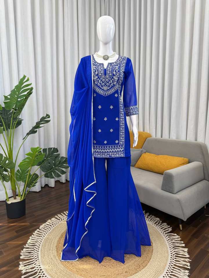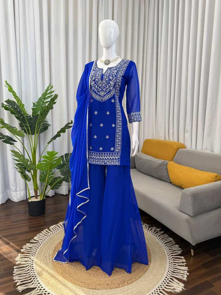 Ensemble Salwar Pakistanaise pour femme en Faux Georgette brodé bleu roi, pour mariage traditionnel, Diwali et tenue de soirée, avec Dupatta, séchage rapide