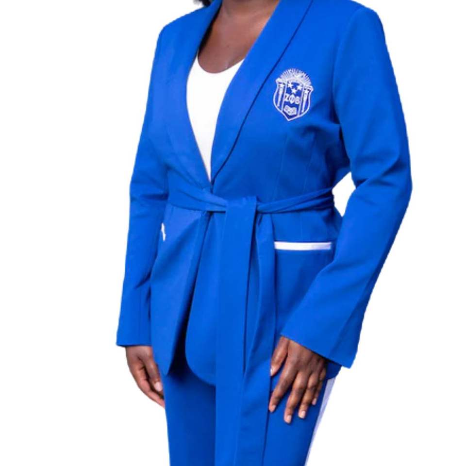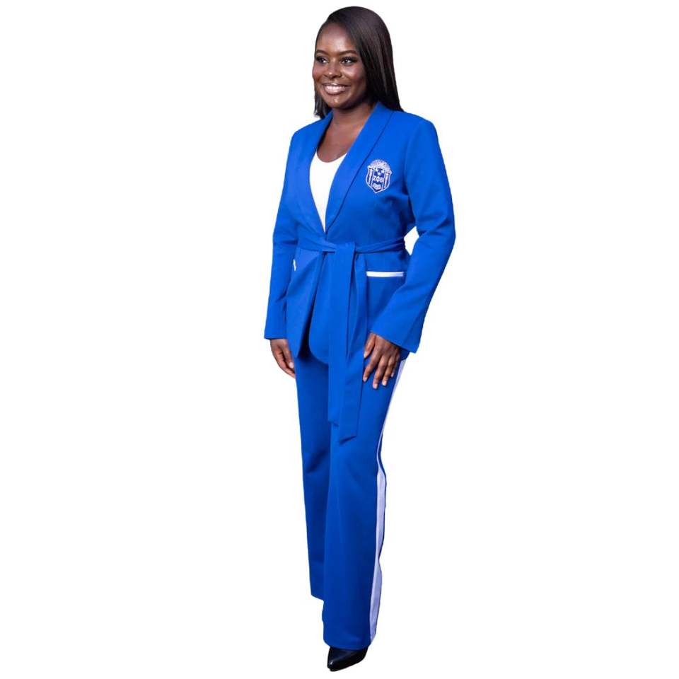 Ensemble de costume bleu royal avec écusson grec brodé pour les événements de sororité et les conférences Tissu doux Coupe confortable