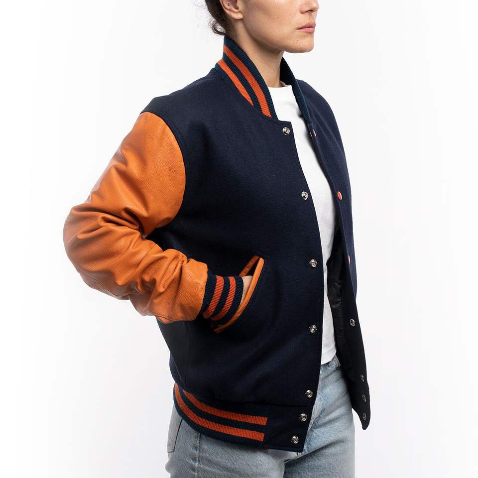 Veste de sport pour femme sur mesure en laine bleu royal et manches en cuir orange brûlé, respirante
