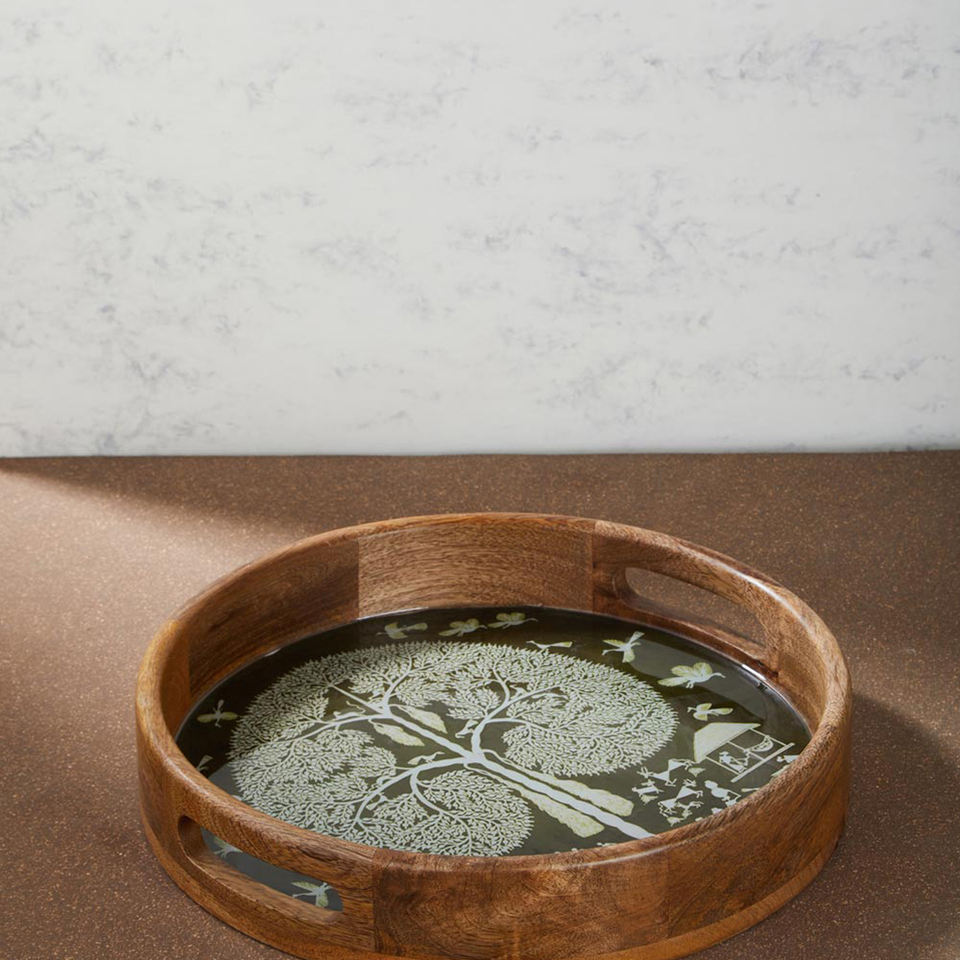 Plateau rond en bois et métal de la collection royale avec poignée Plateau de service en bois le plus vendu en gros de service en bois naturel
