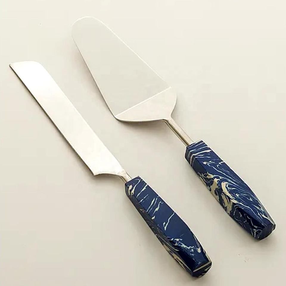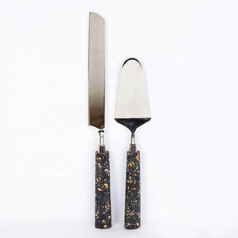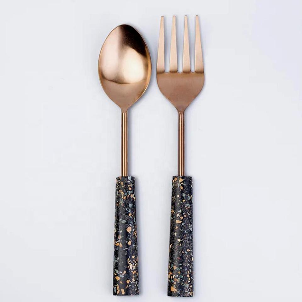 Ensemble de service à salade de table de forme ronde de conception royale, noir, avec manche en résine scintillante dorée, en acier inoxydable, argenté et poli