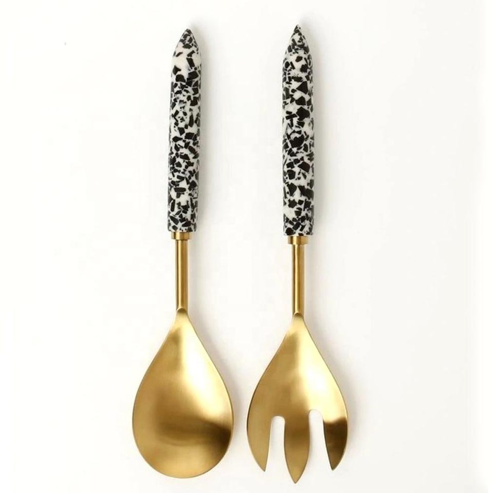 Ensemble de service de salade en acier inoxydable, Design Royal Terrazzo forme ronde poignée noir et blanc plaqué or pour mariage