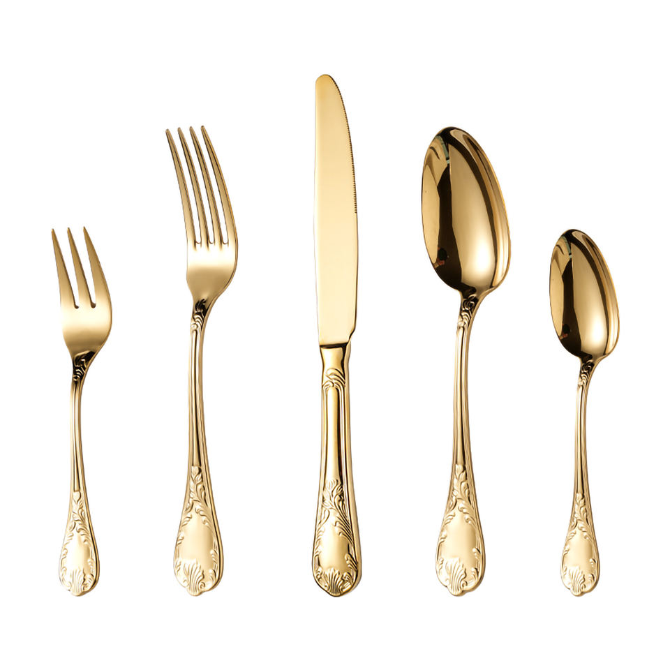 Ensemble de couverts en acier inoxydable à motif floral royal, couverts vintage dorés pour les mariages, les restaurants et les hôtels
