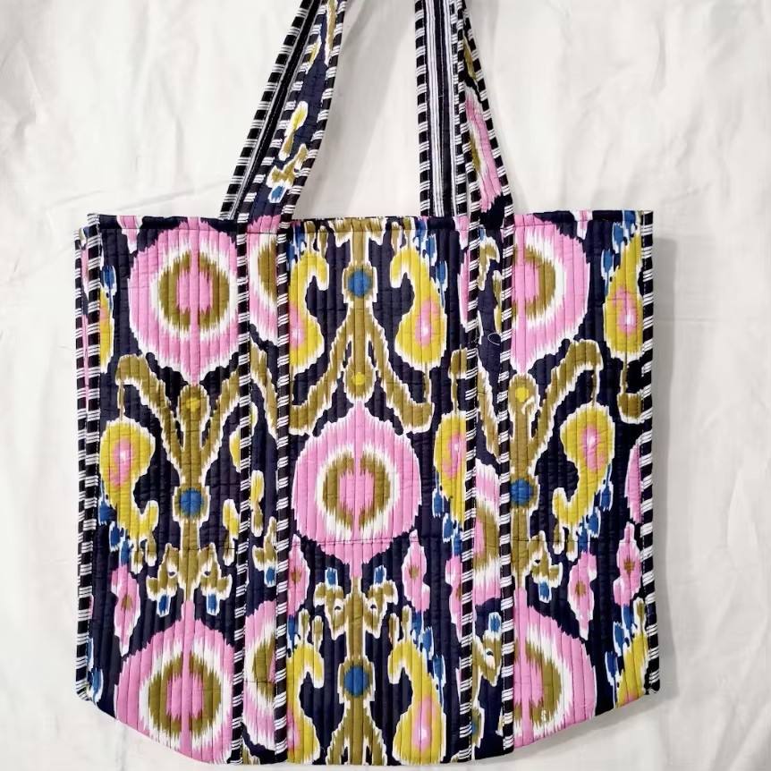 Royal Ikat Garden Carryall Bold Ikat Quilted Tote Bag Eclectic Pink Yellow Indian Custom Design