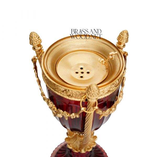 Brûleur d'encens en cristal rouge royal avec base en laiton plaqué or, élégant, artisanal, luxe, Mabkhara
