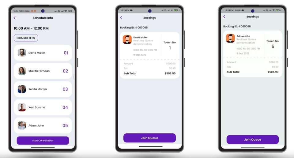 Développement d'applications mobiles de gestion des files d'attente RoyalCraft pour Android et iOS avec réservation par jeton, suivi des files d'attente en temps réel et notifications.