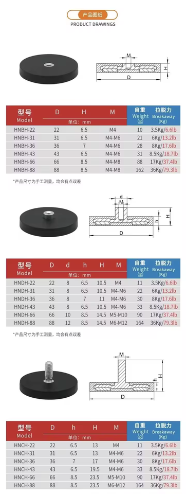 Taille du support recouvert de caoutchouc:Diamètre de base circulaire 22MM 36MM 43MM 66MM 88MM avec filetage M4 M6 M8