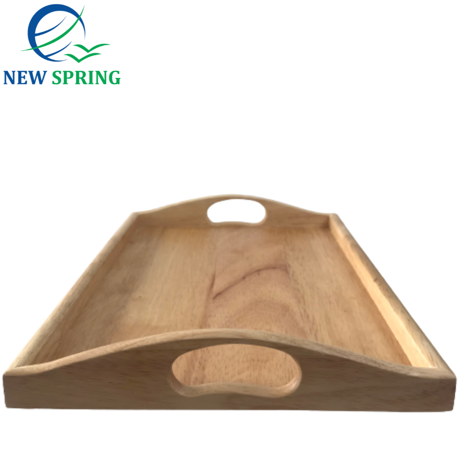 Nouveau printemps Logo personnalisé plateau de service en bois de caoutchouc Durable poignée en caoutchouc facile à nettoyer usage domestique plateau de nourriture décoratif nouveau Design
