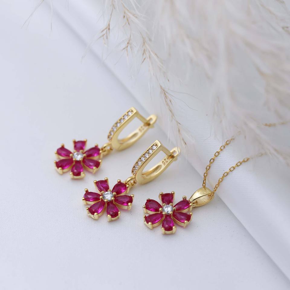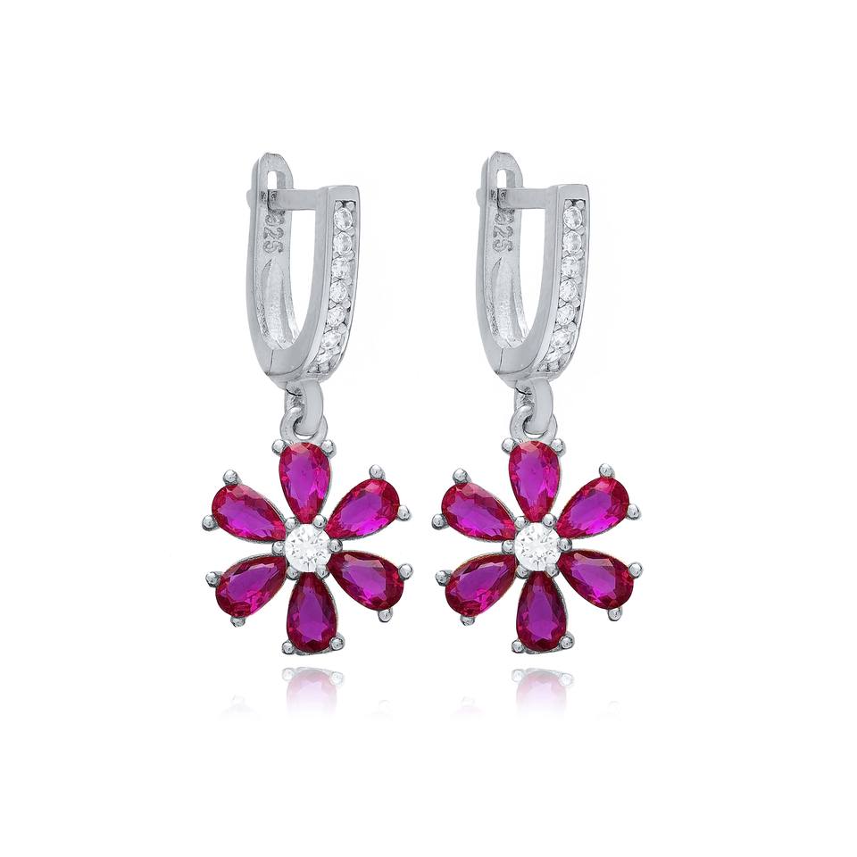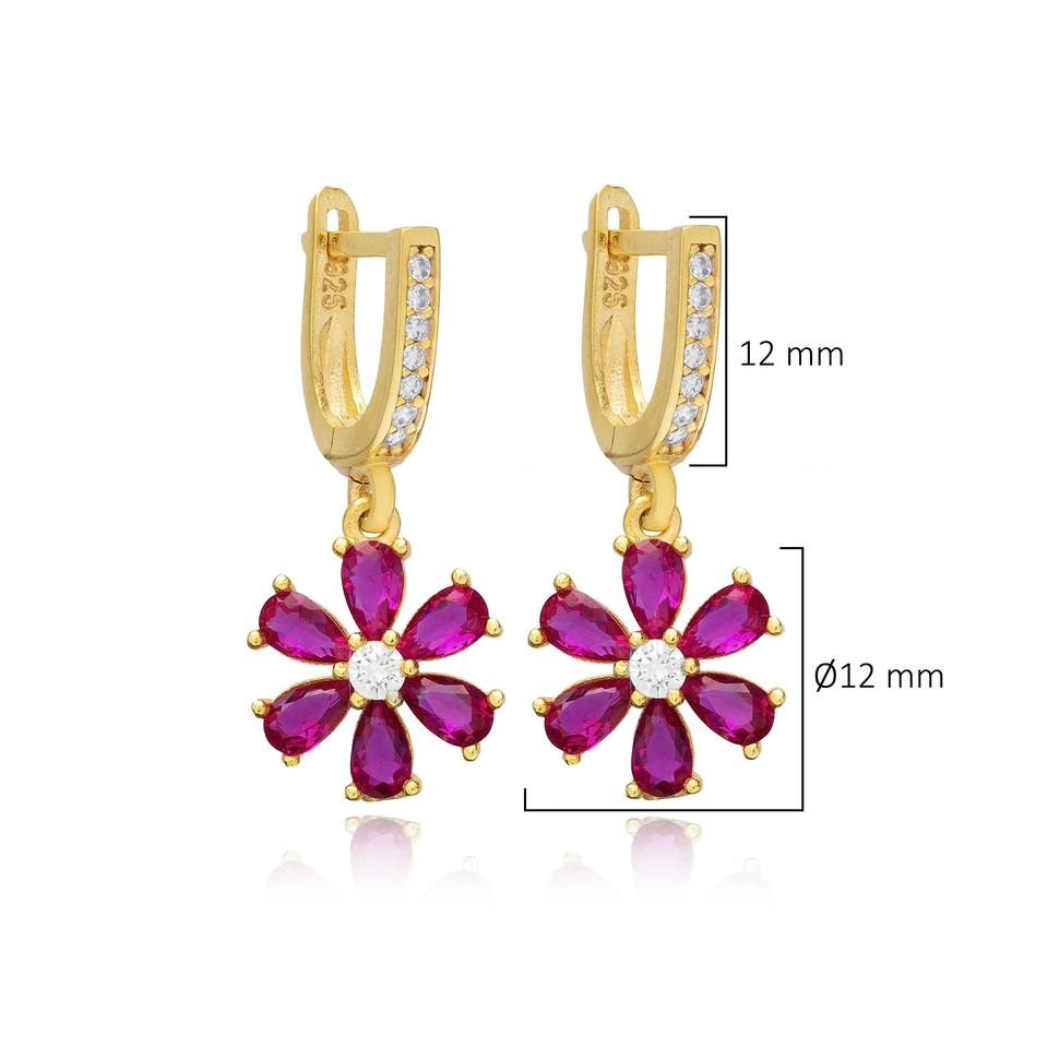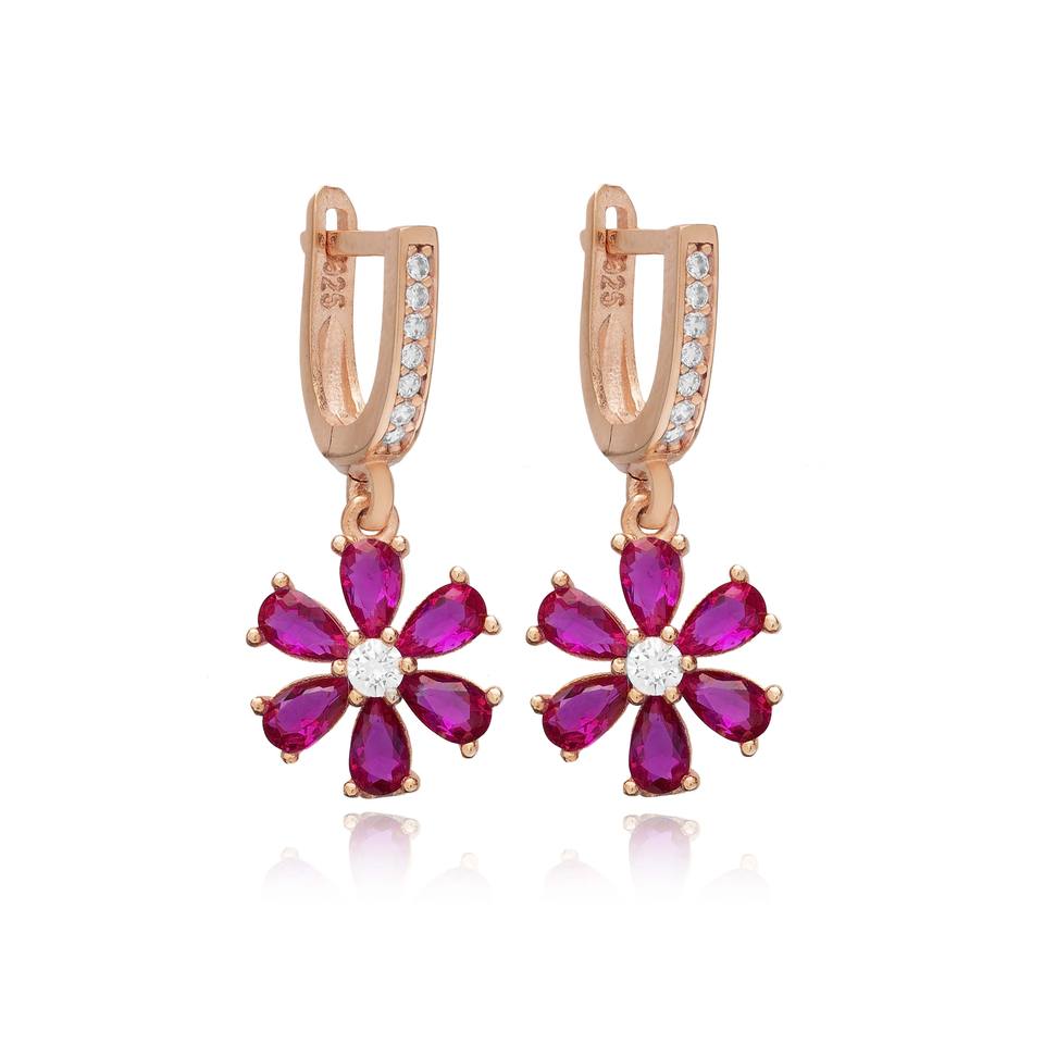 Boucles d'oreilles pendantes turques en argent sterling 925 avec pierre CZ rubis et motif floral, bijoux fins turcs en gros