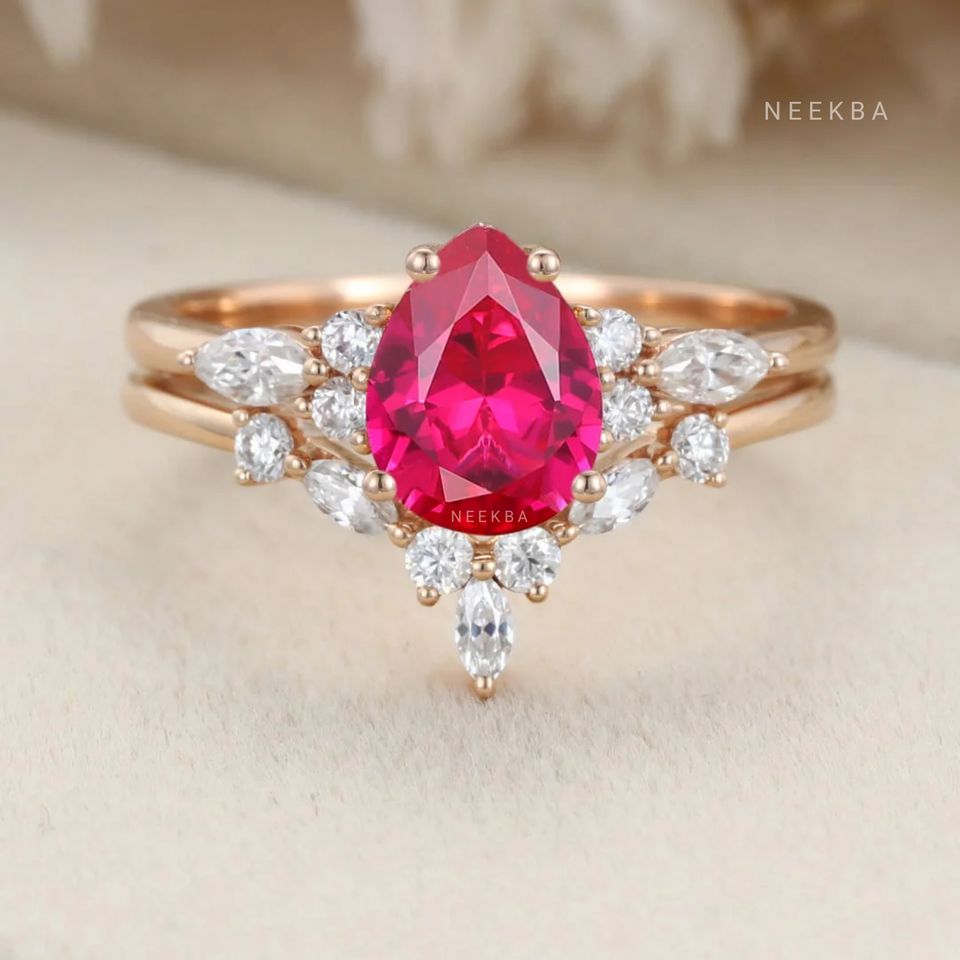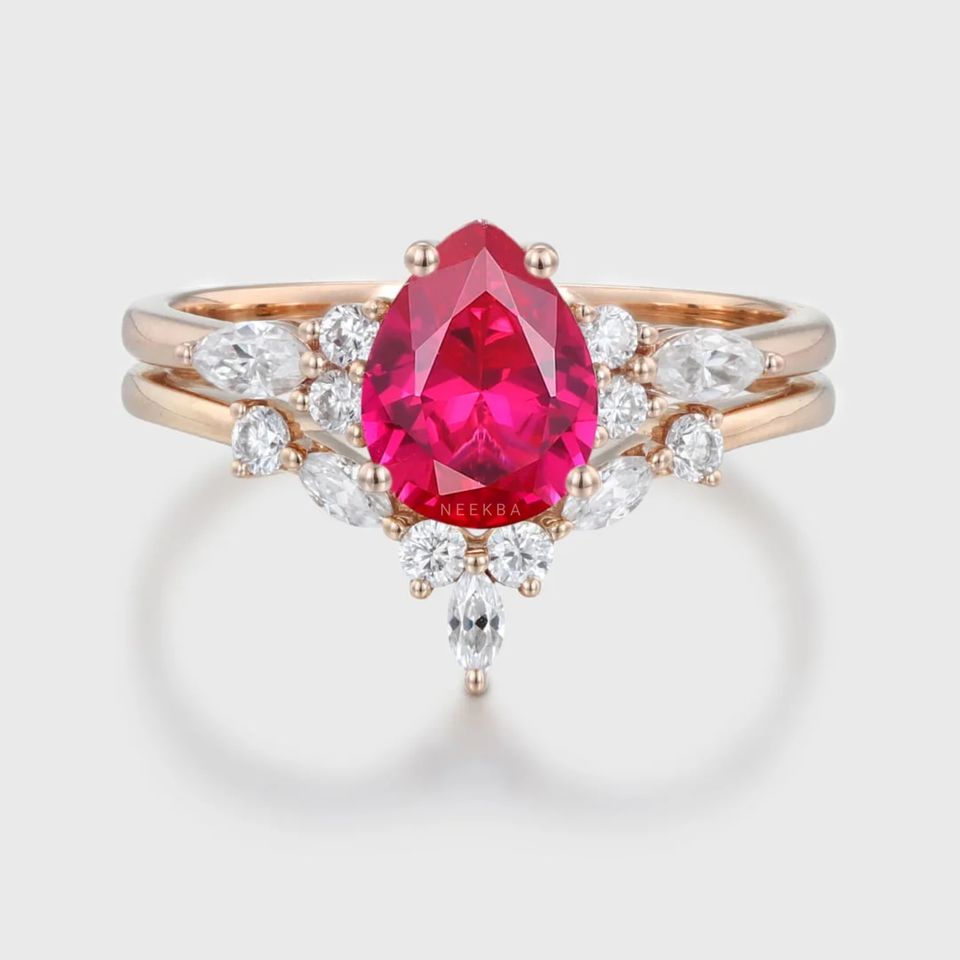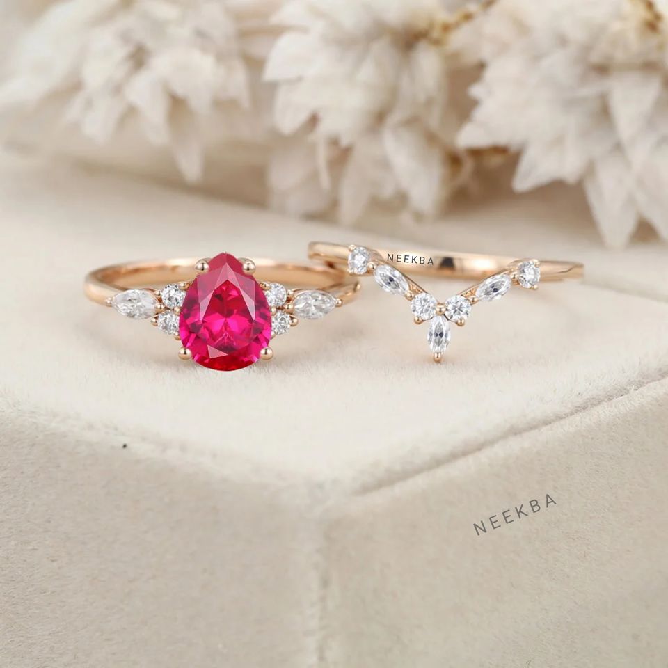 Ensemble de bagues de mariée rubis et moissanite-Bague de fiançailles en forme de poire avec alliance en moissanite contour en or rose massif 14 carats
