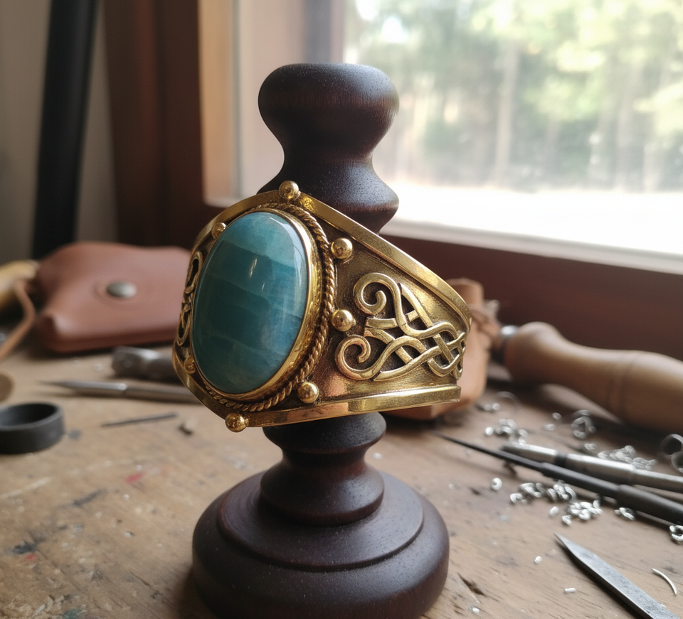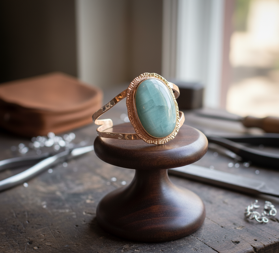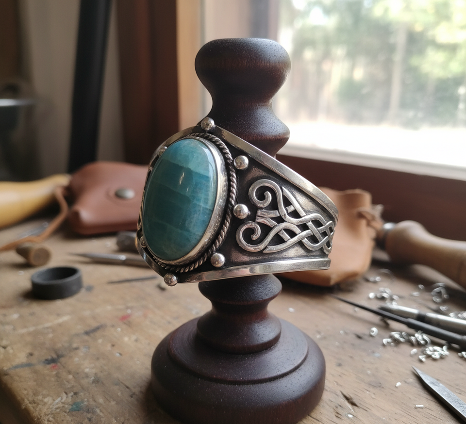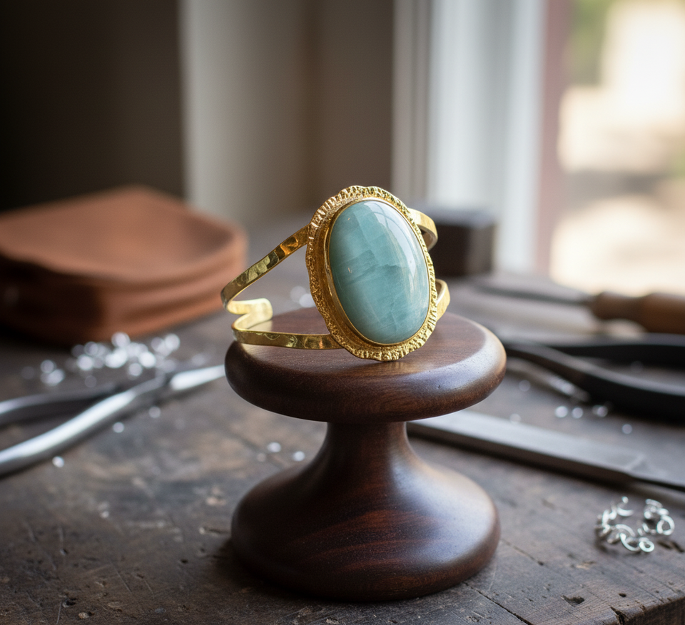 Rudra Gems Handcrafted Natural Amazonite Cabochon High Quality Tibetan Silver Beaded Bracelets 14K Gold Fashionable Bangles