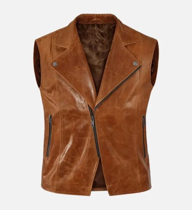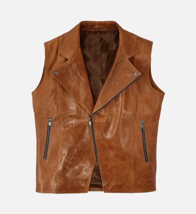 Rugged Antique Brown Genuine Leather Motorcycle Jacket Vest Men O-Neck Collar Breathable Outerwear