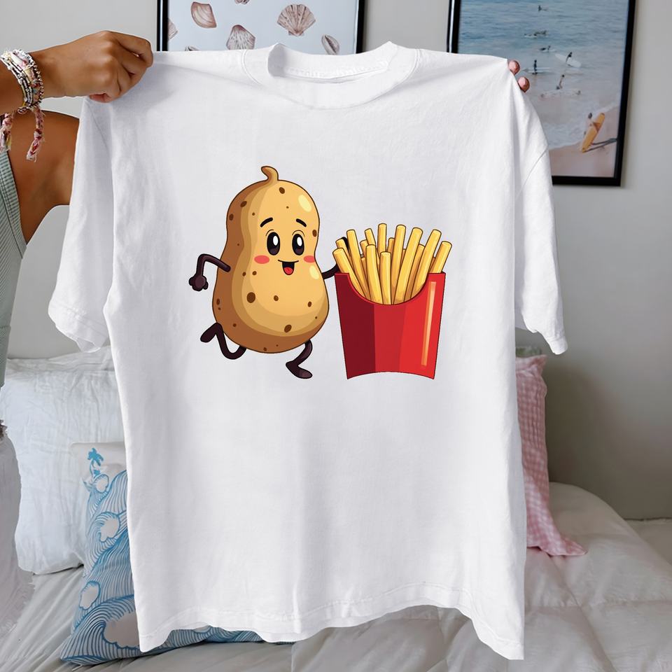Casual Running Potato and Fries Cartoon Knitted 100% Cotton Women's T-Shirt Comfort Fit