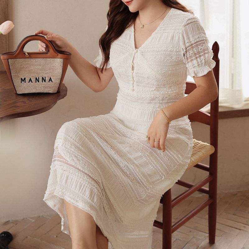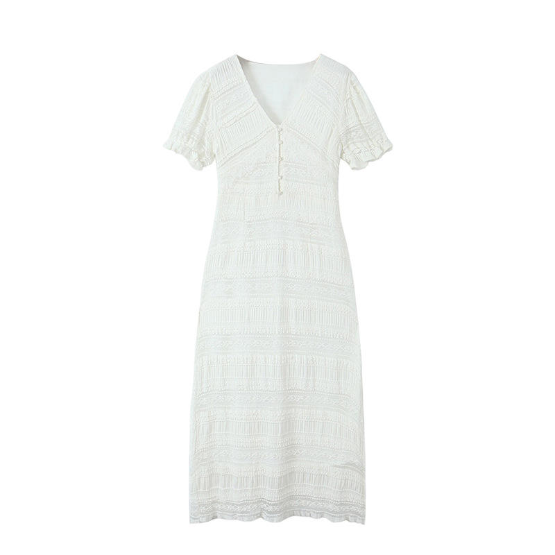 Robe Courte Décontractée Quotidienne Runqi N8701 en Dentelle Col V Taille Cintrée Blanc Jasmin à Manches Courtes pour Femme