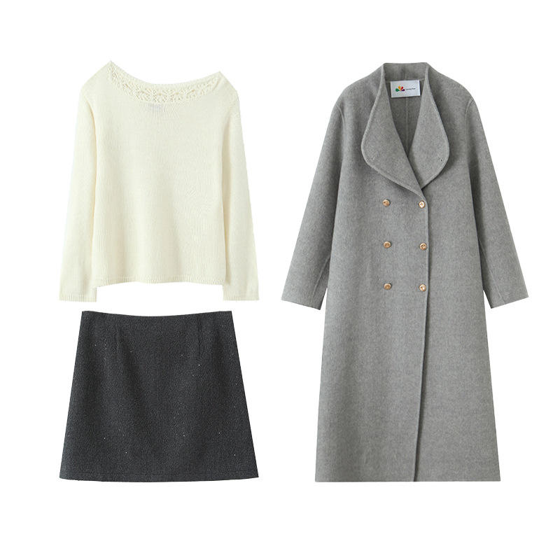 Haut fleur de poirier blanc, jupe gris galaxie, manteau gris claircouleur