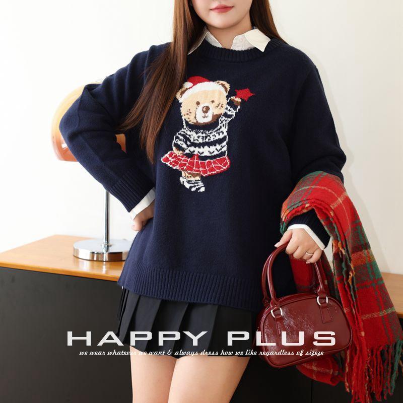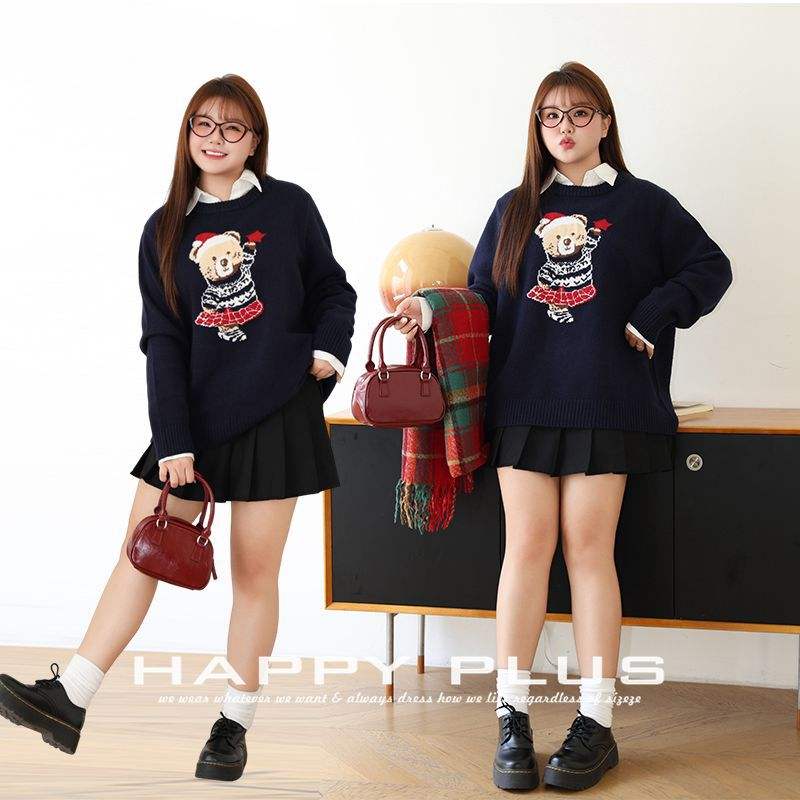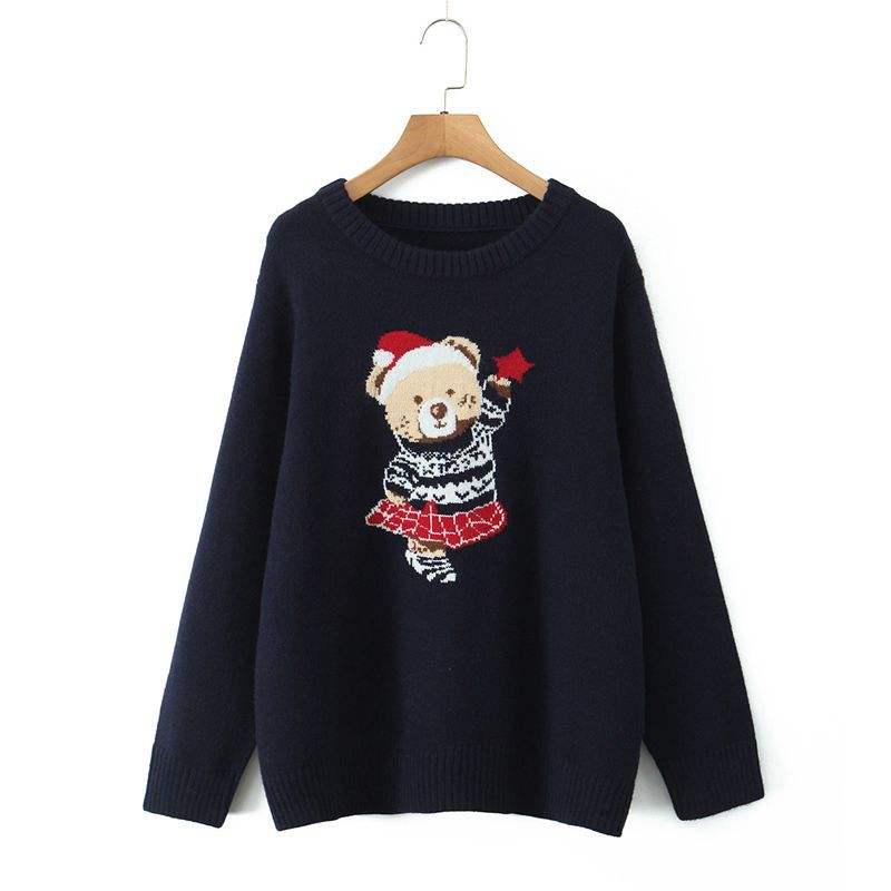 Pull pour femme grande taille Runqi avec motif d'ours brodé en jacquard, col rond, design de dessin animé N9040 1
