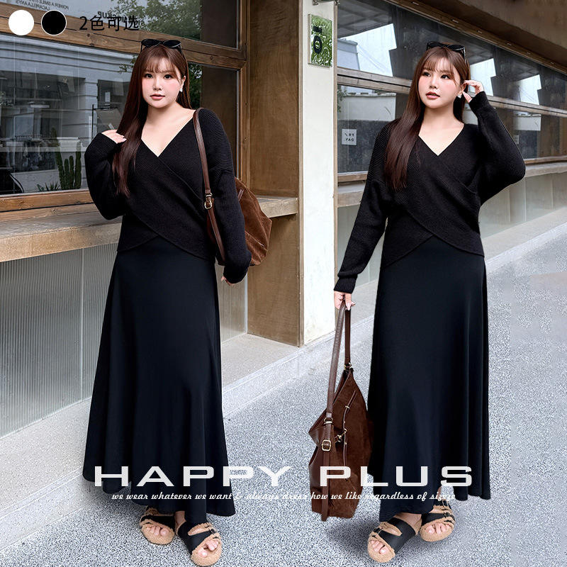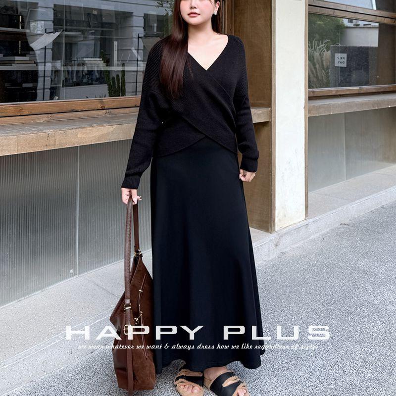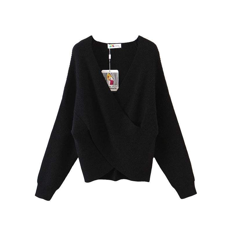 Pull col V Runqi grande taille noir à motif croisé coupe ample tricoté pour femme épaisseur moyenne avec étiquette