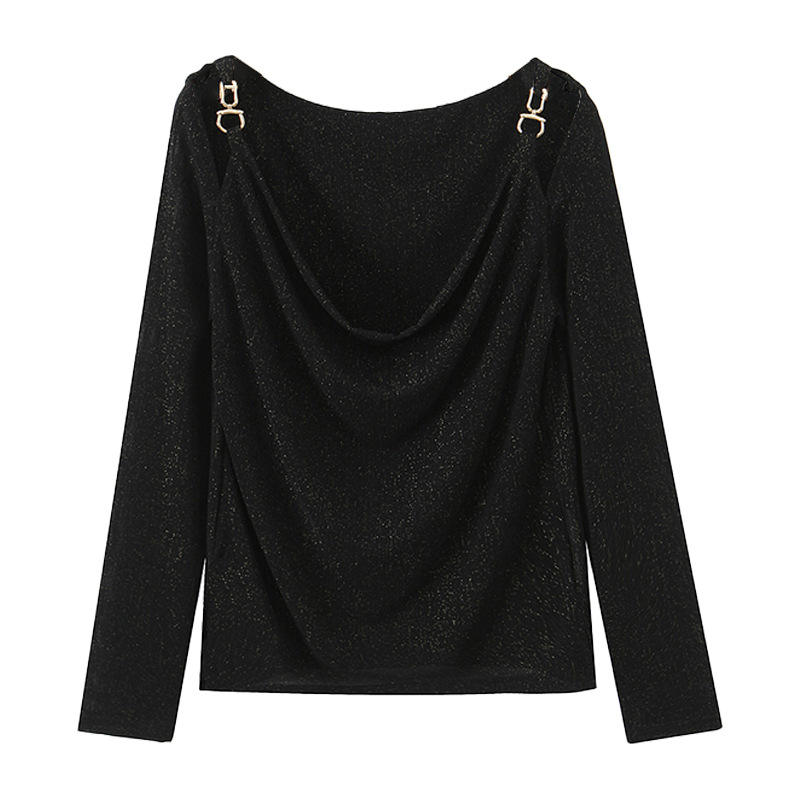 Runqi – Haut en maille à épaules dénudées et col drapé pour femme, noir, grande taille, couleur unie, manches longues, chemisier scintillant pour l'automne