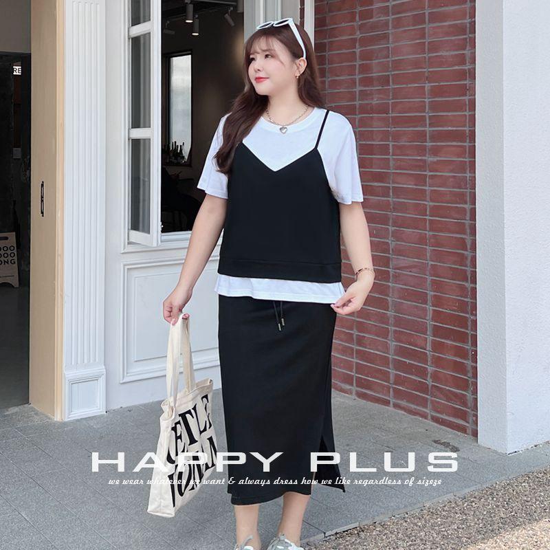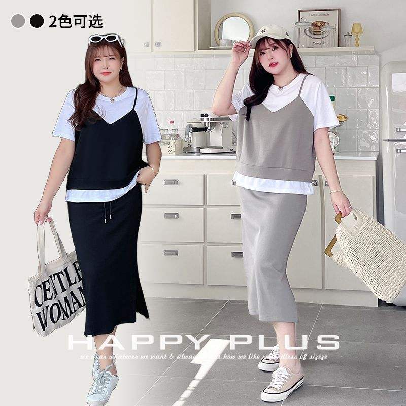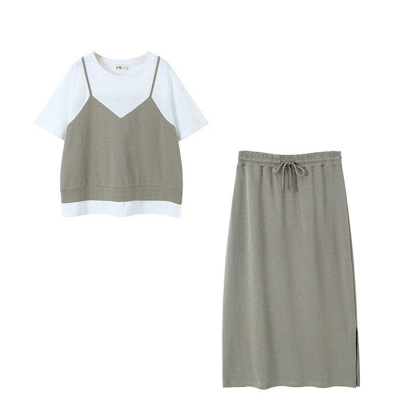Ensemble deux pièces pour femmes Runqi, haut et jupe gris, manches courtes, couleurs contrastées, tricot de coton, vêtements de sport décontractés, grande taille