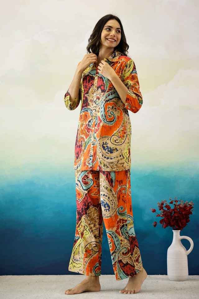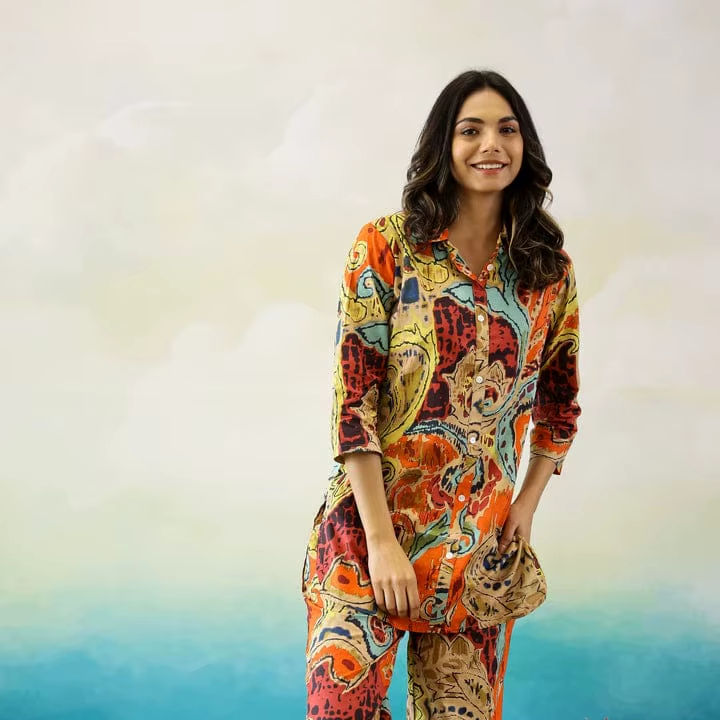 Ensemble coordonné décontracté en coton abstrait Rust, comprenant un haut en coton lourd brodé avec col et boutons sur le devant