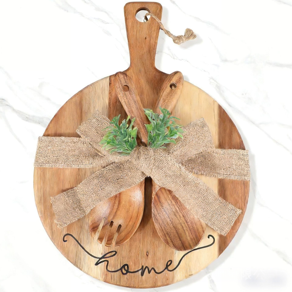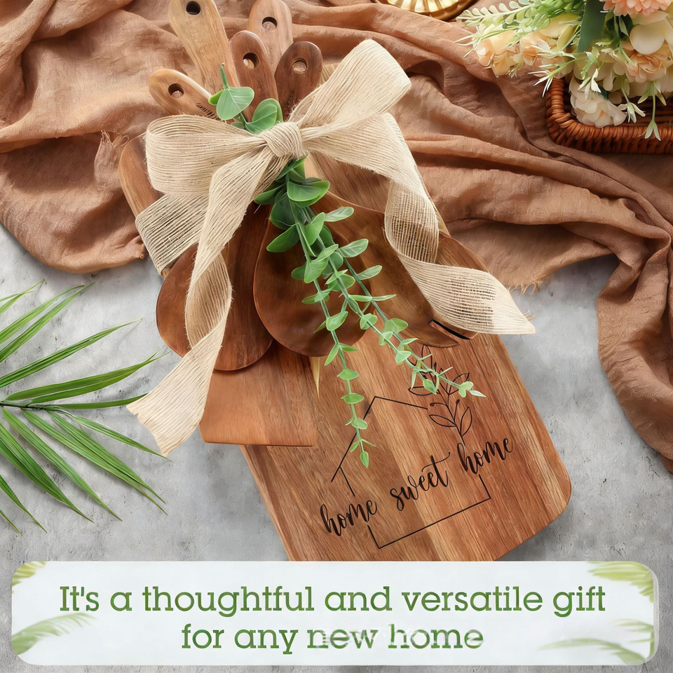 Ensemble de planches à découper en bois d'acacia rustique avec cuillères gravées « Home Sweet Home », plateau à charcuterie pour agent immobilier, cadeau de pendaison de crémaillère