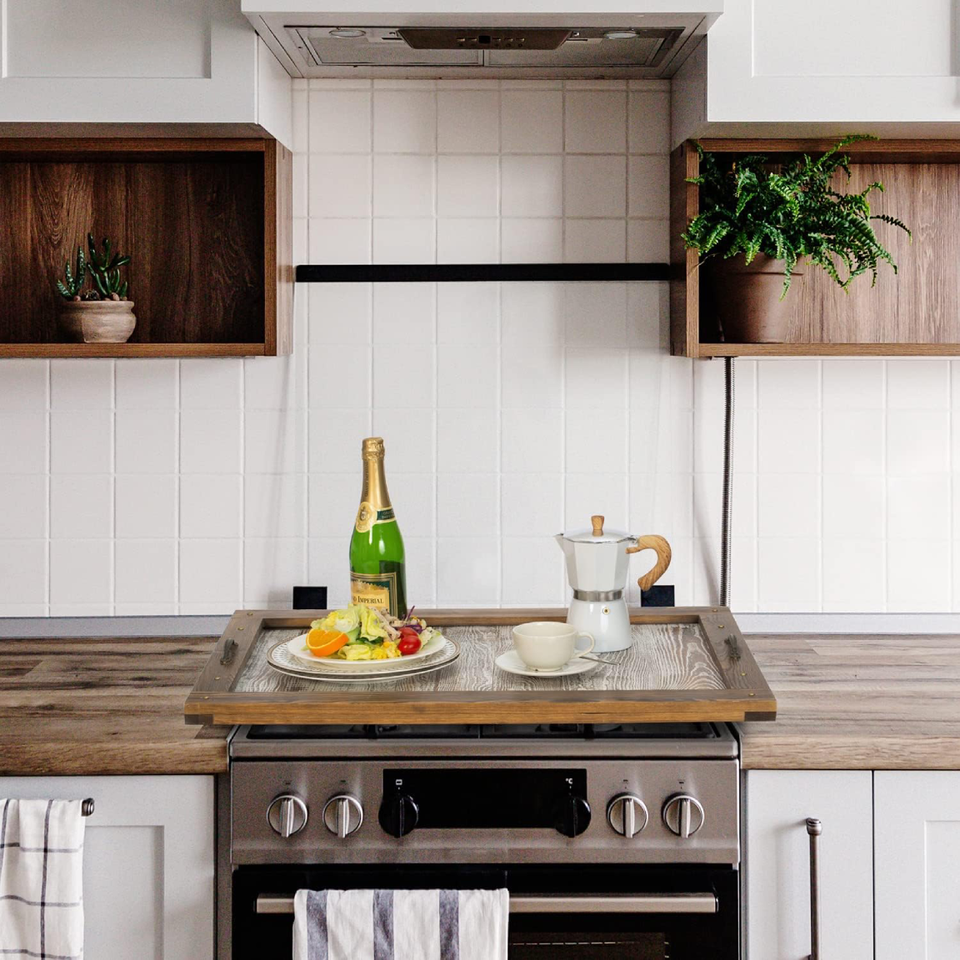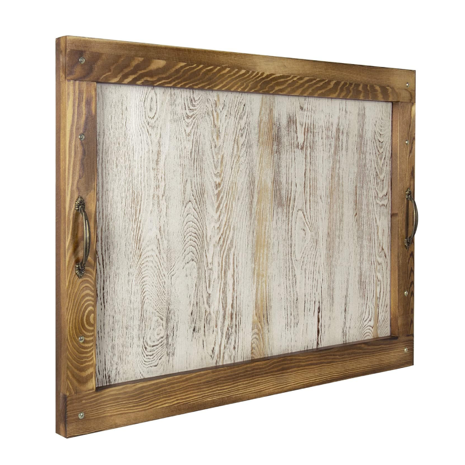 Plateau de service fait à la main en bois de pin brun rustique avec poignée en métal grande taille pour une élégance fonctionnelle servant et coiffant votre maison