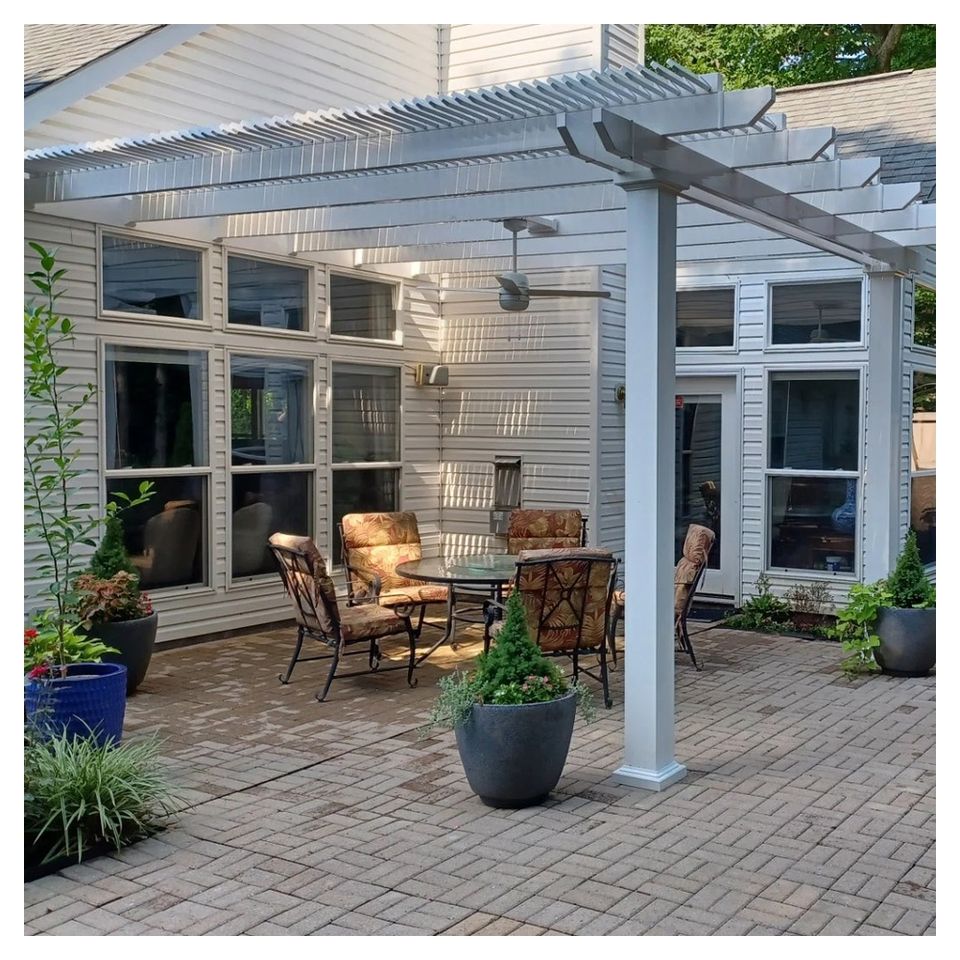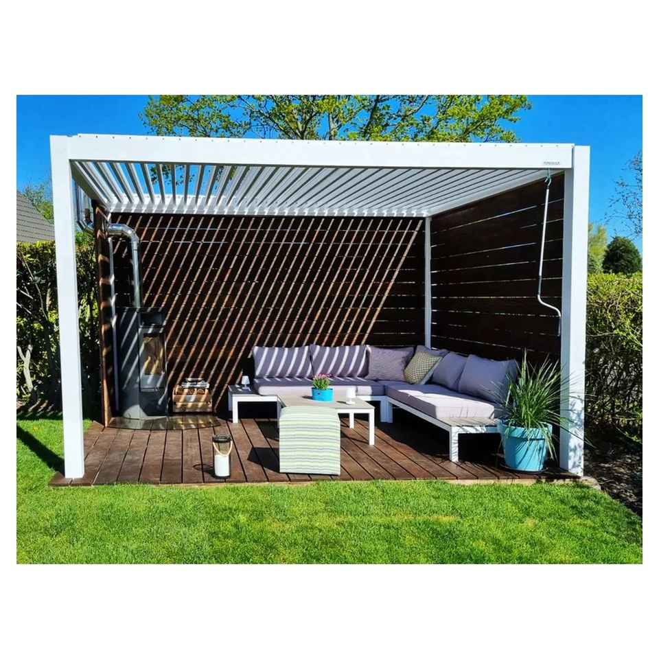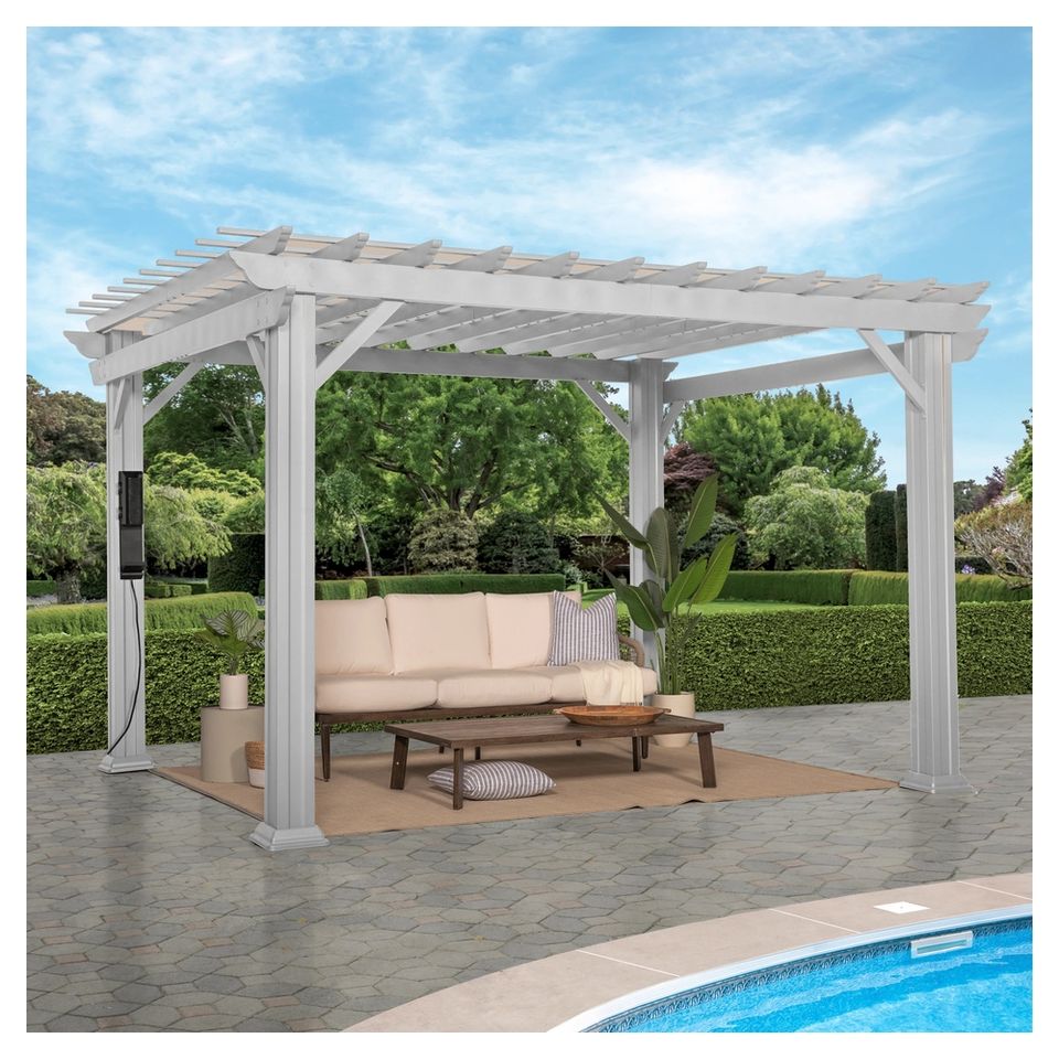 Pergola rustique en bois de cèdre avec toit en chaume et bases de colonnes en pierre pour jardin traditionnel et pergola de vignoble