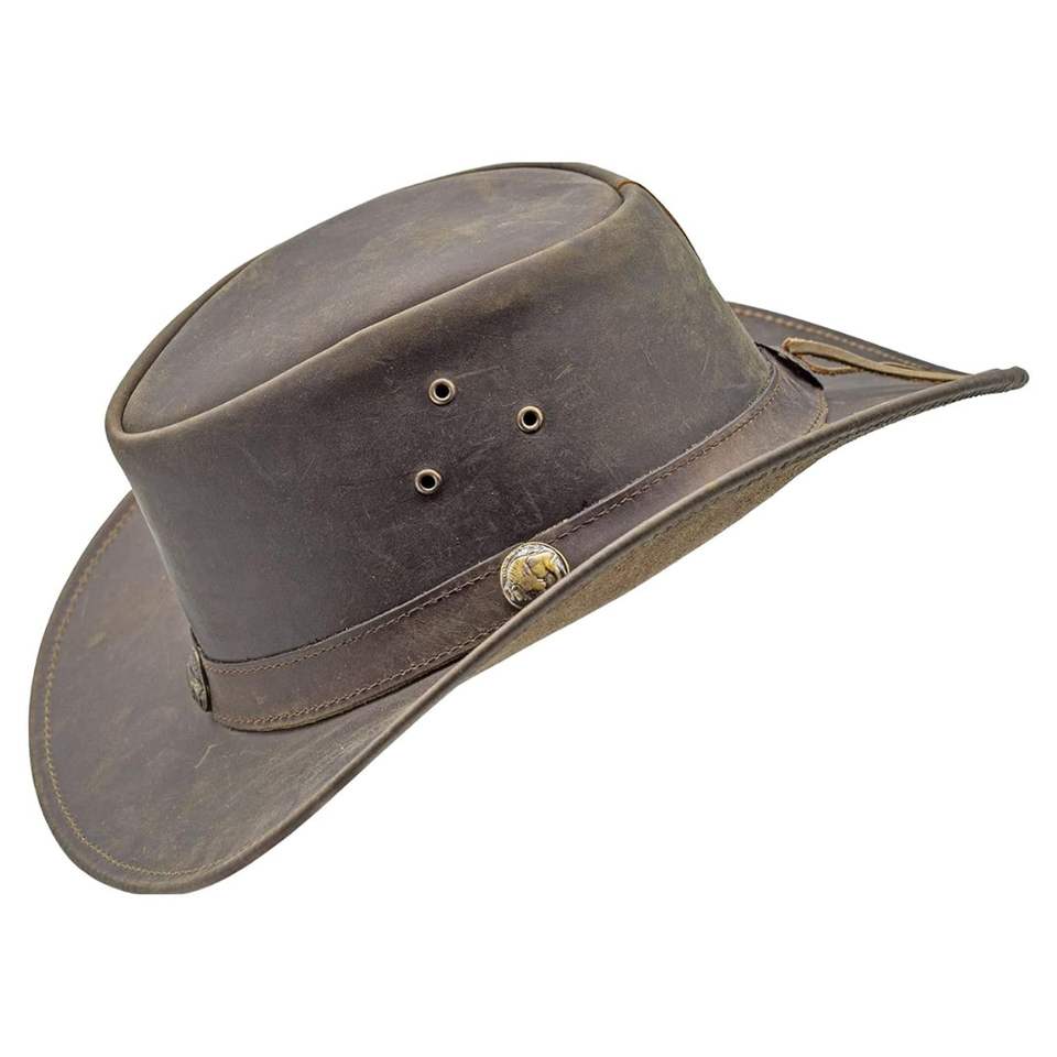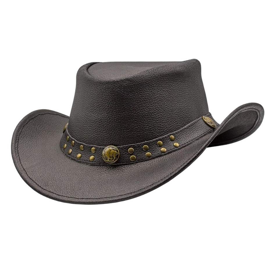 Chapeau de cowboy en cuir vieilli style rustique, type Outback, avec sangle de menton et bande ornée de conchos