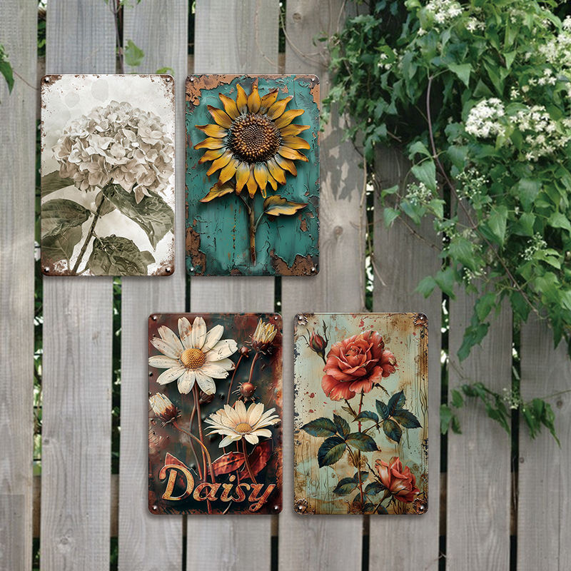 Plaque murale décorative en métal rustique à motif floral (tournesol, rose, marguerite, hortensia) pour la maison, la cuisine, thème jardin vintage