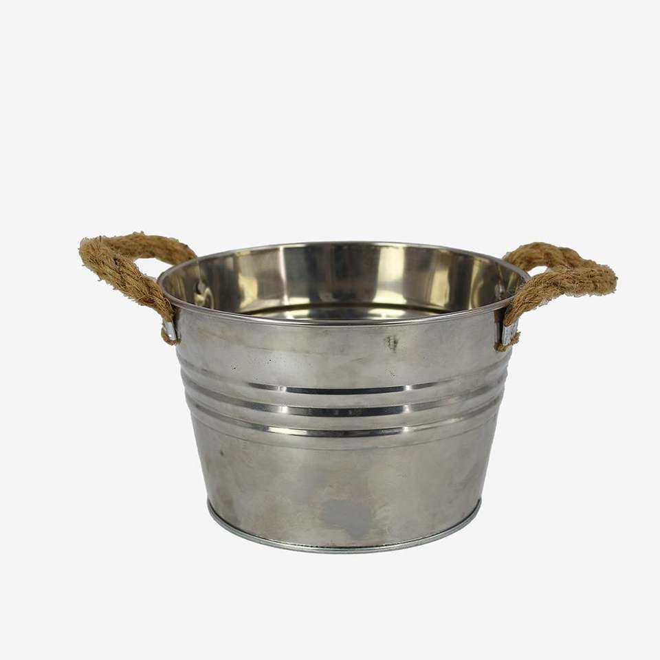 Pot de fleurs rond en métal galvanisé rustique argenté avec poignée en corde, pot de jardin industriel, pot en métal en gros