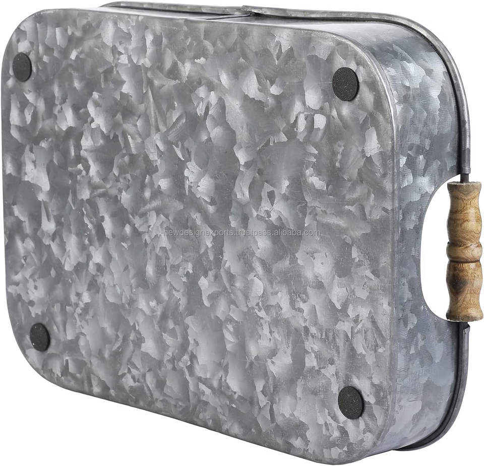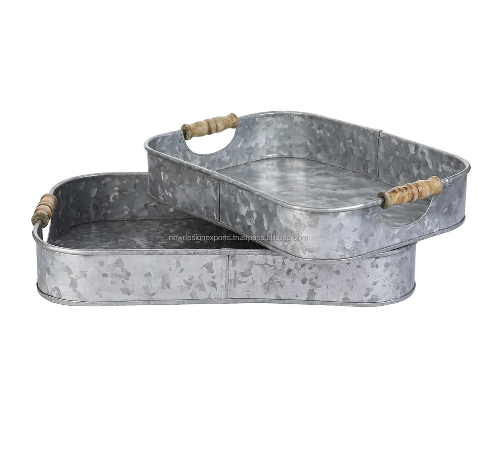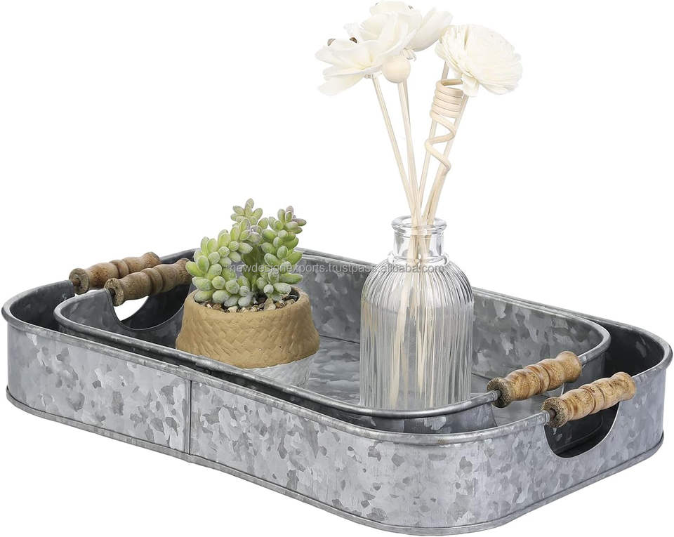 Plateau décoratif moderne en métal galvanisé avec poignées en bois, plateaux de service rectangulaires emboîtables, motif paysager, lot de 2, fabriqué à la main en Inde