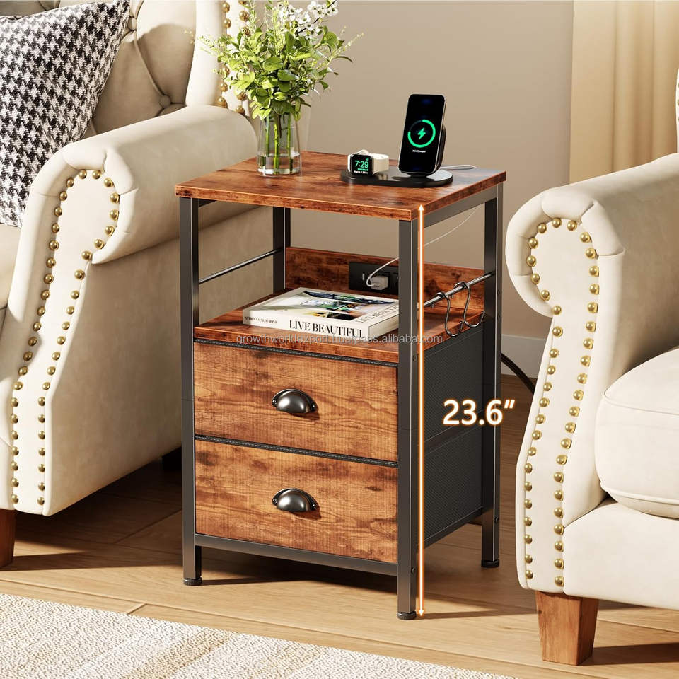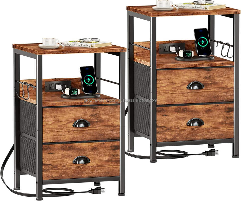 Table de Chevet Rustique en Bois Massif de Mangue, Lot de 2, avec Station de Recharge et 2 Tiroirs, Table d'Appoint Moderne Faite à la Main