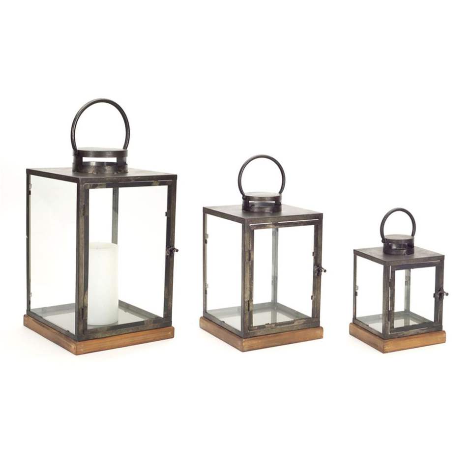Ensemble de lanternes rustiques en métal et verre avec base en bois, porte-bougie décoratif suspendu pour extérieur, idéal pour centre de table de mariage et de fête, vente en gros