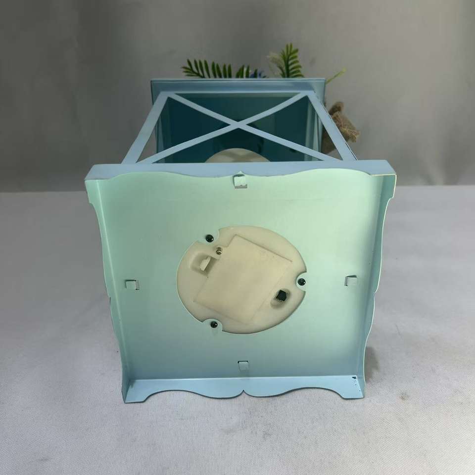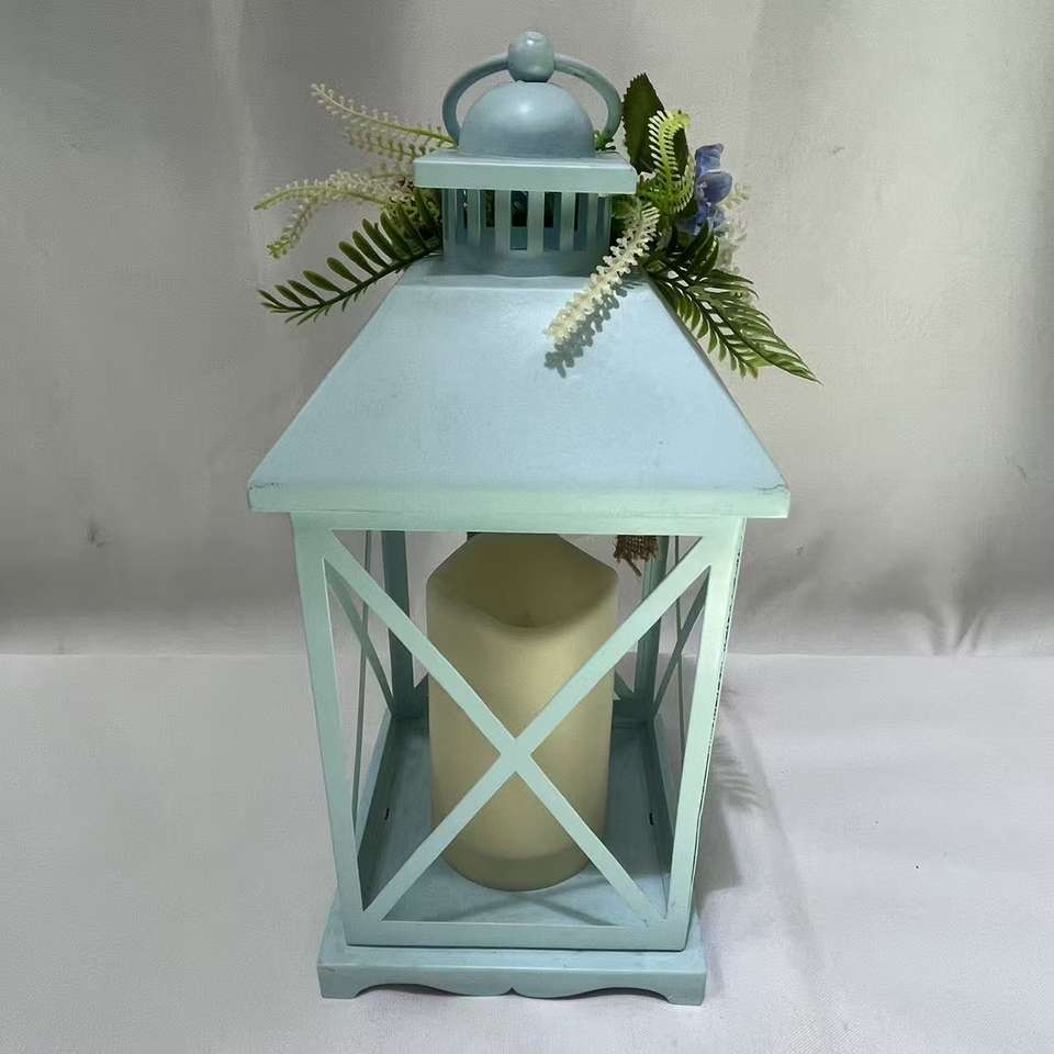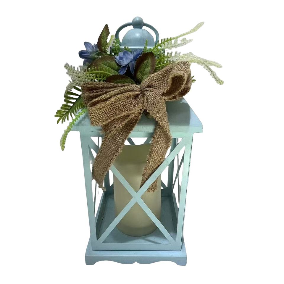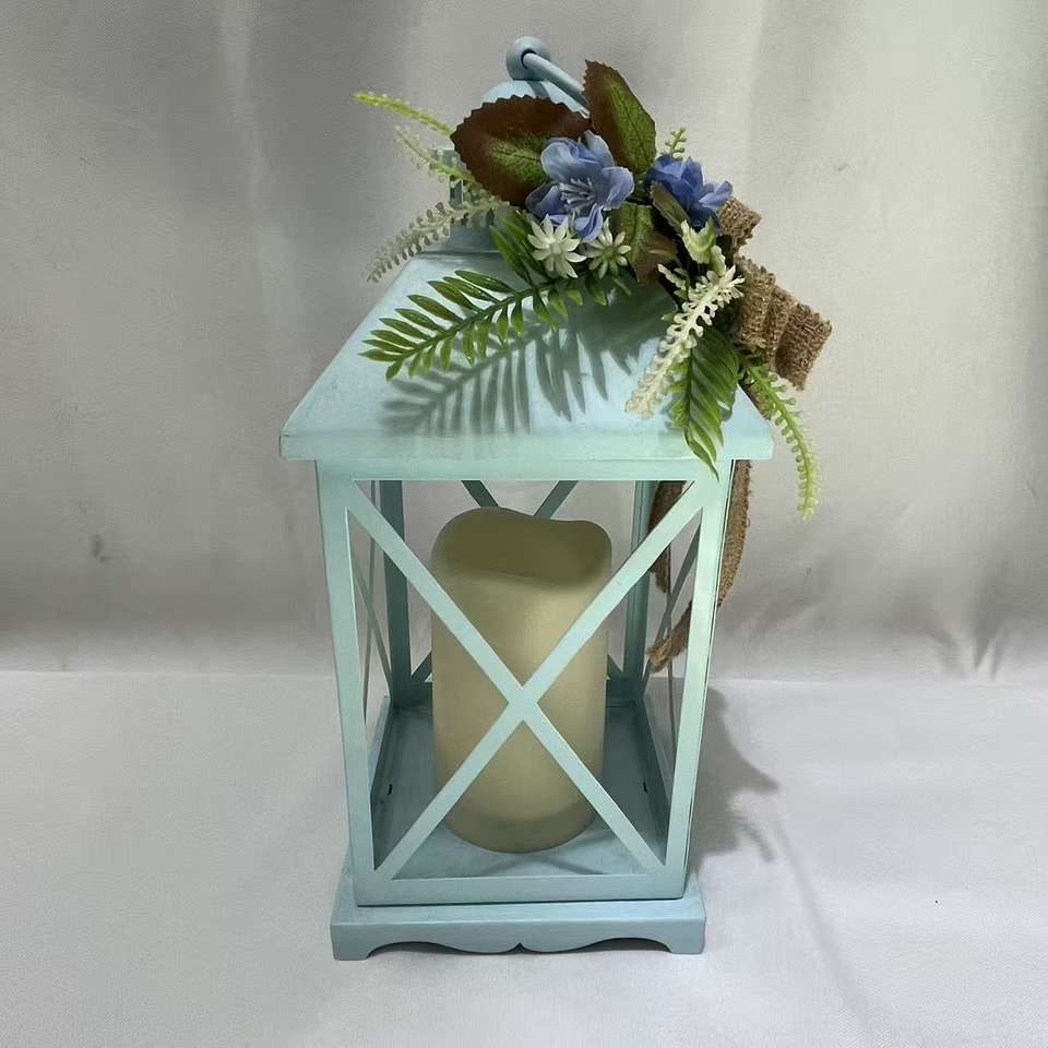 Lanterne à vent bleu pastel rustique avec embellissement floral, lanterne à bougie suspendue pour la décoration de la maison, du jardin et du patio