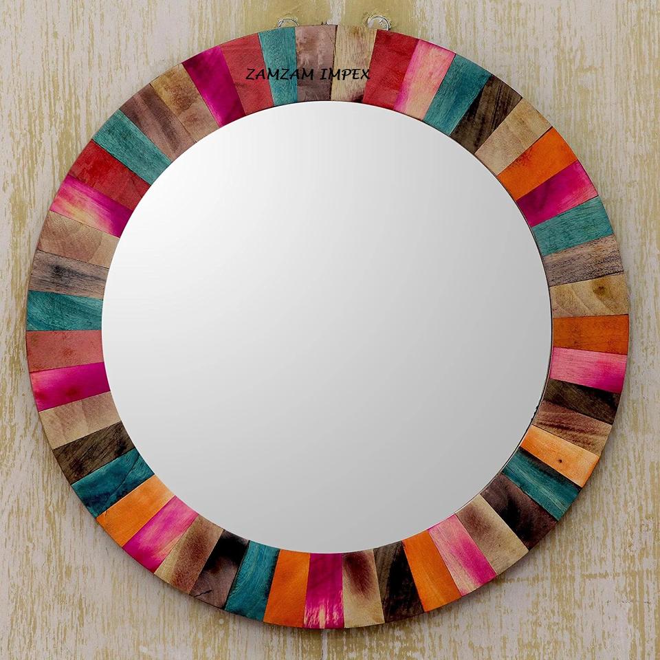 Miroir mural rond rustique en bois de manguier avec finition multicolore pour la maison, le salon et la décoration d'entrée