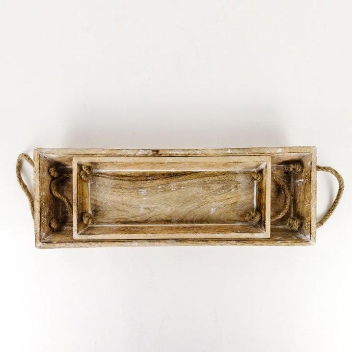 Plateau de service rectangulaire en bois massif rustique avec poignées en corde naturelle, fabriqué à la main, idéal pour la cuisine