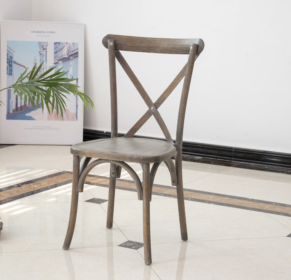 Chaise rustique empilable en bois de hêtre à dossier croisé pour mariage, événement, banquet, salle à manger
