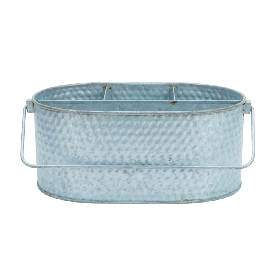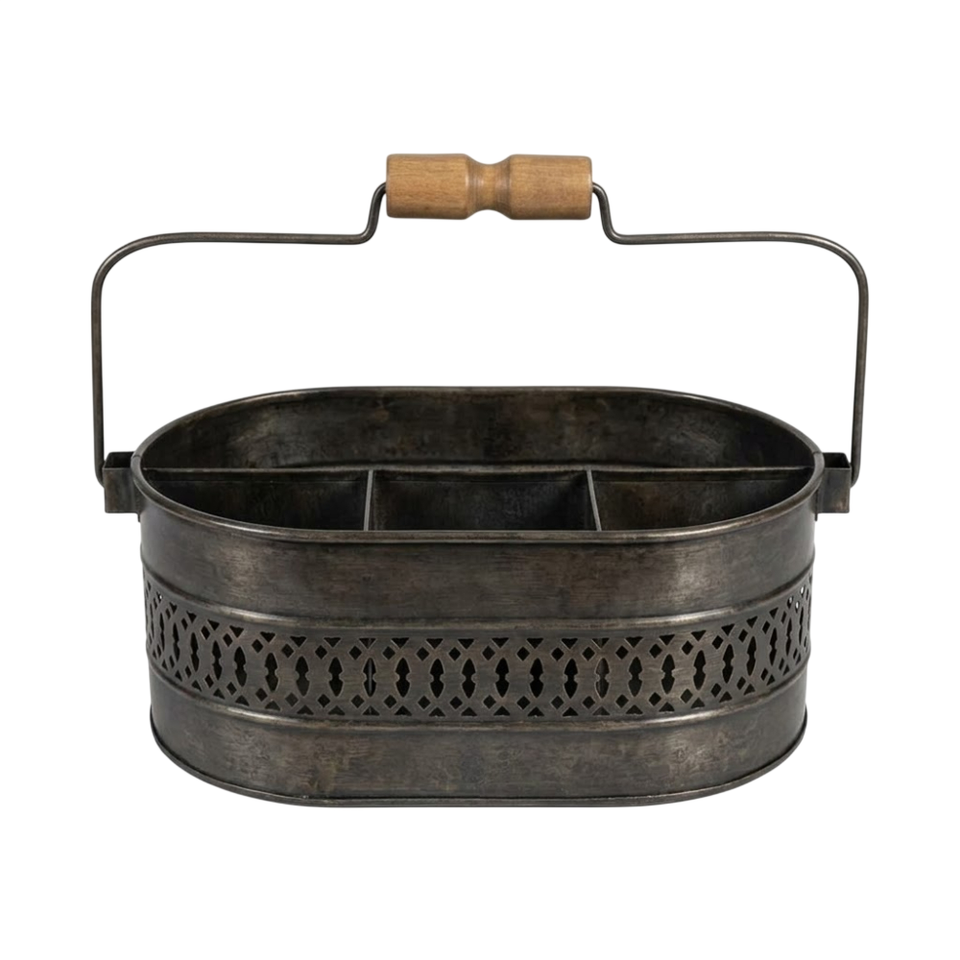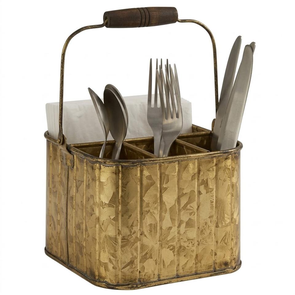 Porte-couverts ovale en métal galvanisé de style rustique avec poignée en bois, finition laiton antique, 6 compartiments, style ferme