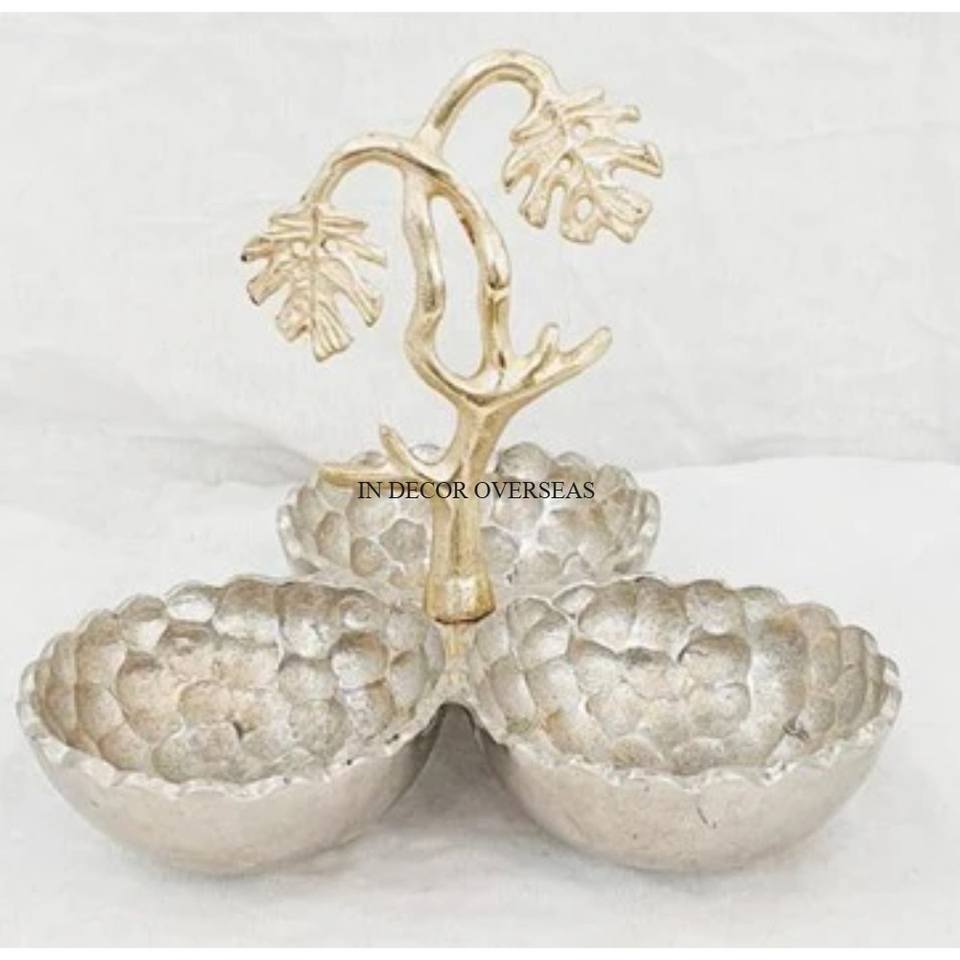 Bol en métal poli brillant argenté à texture unique inspiré de l'art vintage rustique avec des poignées de designer de feuilles plaquées or d'Inde