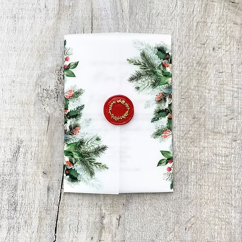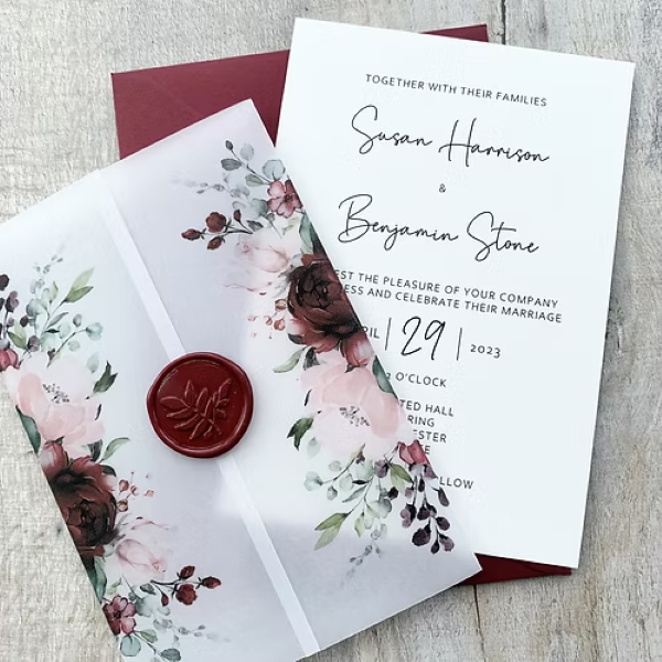 Inclure:Carte acrylique de 1 à 2 mm d'épaisseur + enveloppe + sceau de cire + carte RSVP