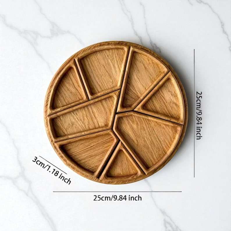 Plateau de service rustique en bois à compartiments, plateau rond pour collations, fruits et apéritifs, plateau à thé en bois finition huilée, style Wabi Sabi Japandi