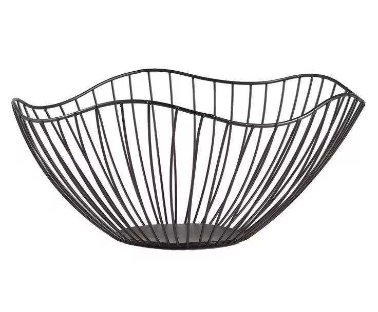 Corbeille à fruits rustique en métal noir avec des détails complexes et un cadre robuste, idéale pour le rangement quotidien et la décoration de la cuisine.