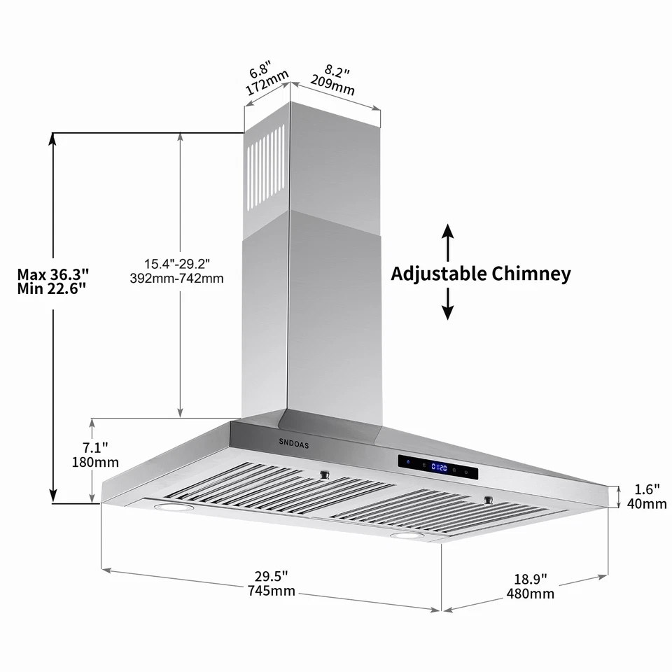 S-N-D-O-A-S 30i-n W-a-l-l M-o-u-n-t R-a-n-g-e H-o-o-d V-e-n-t en acier inoxydable avec conduites de ventilation sans soudure et LED, nouveau modèle