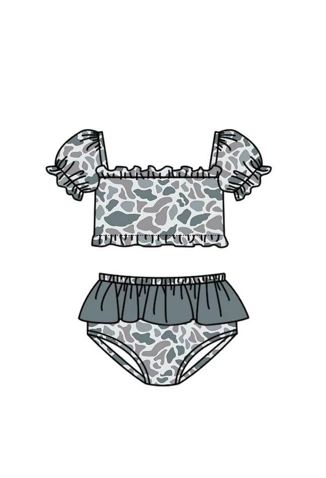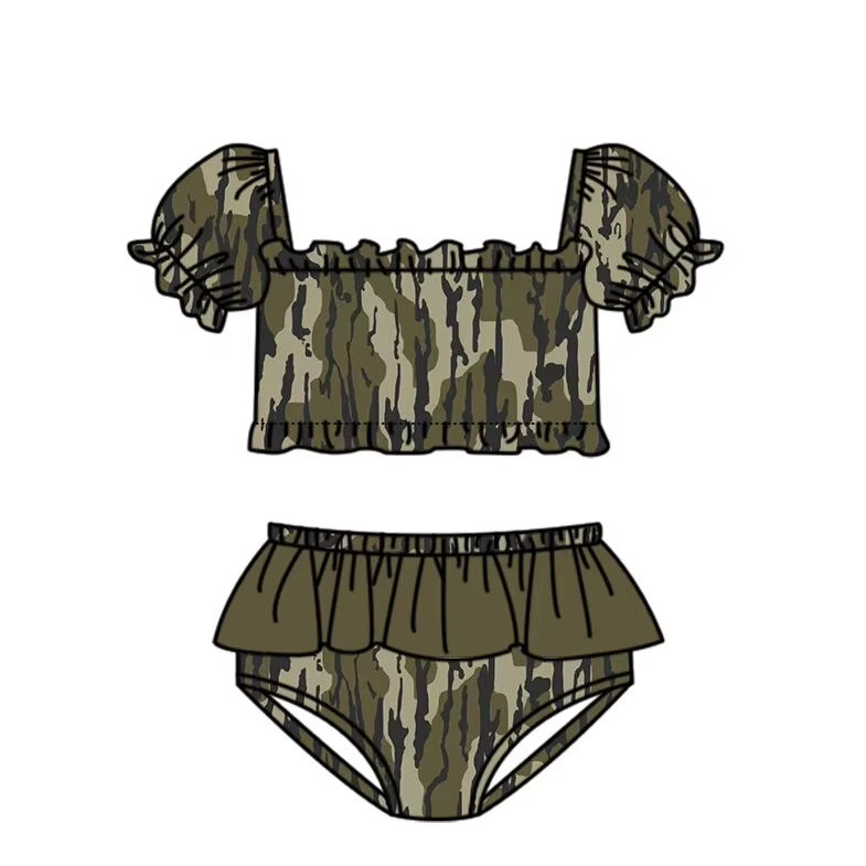 S0760 Maillot de bain personnalisé pour petite fille active, imprimé camouflage vert, vente en gros, ensemble 2 pièces à manches courtes