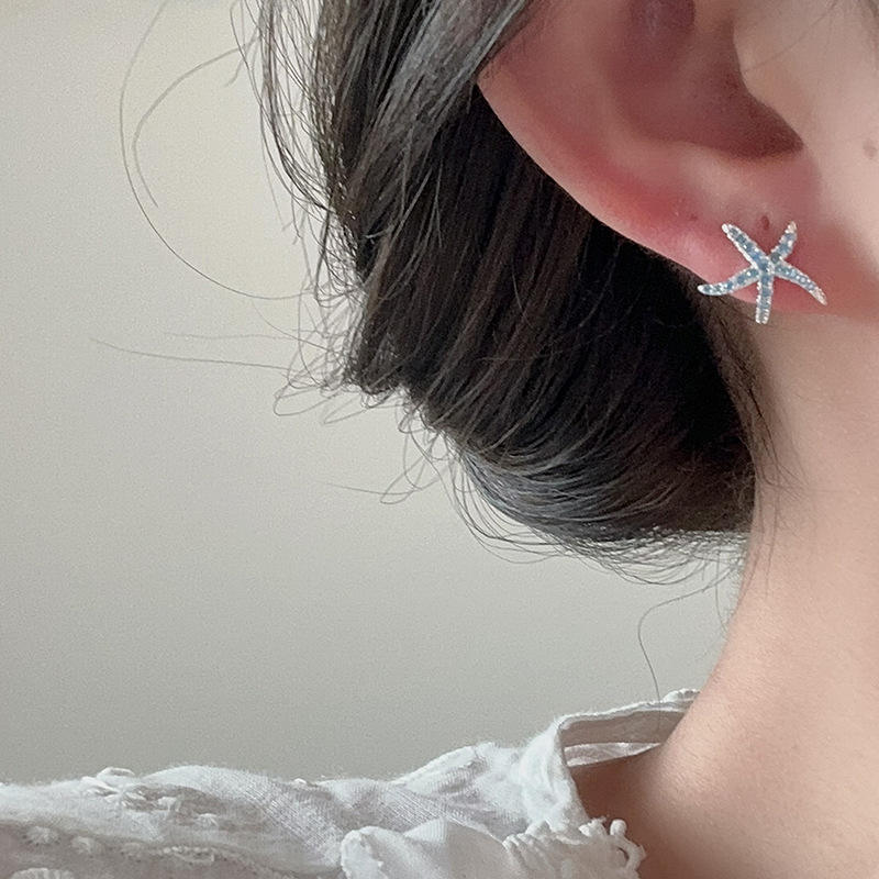 Boucles d'oreilles en argent pur S925 avec étoile de mer sertie de diamants bleus, style simple, compact, tendance, fraîche, été, boucles d'oreilles en zircon pour femmes