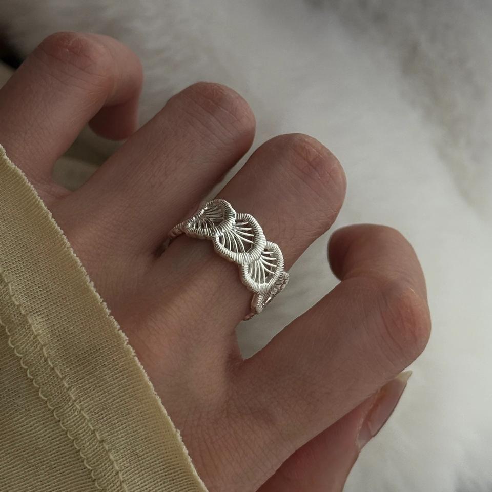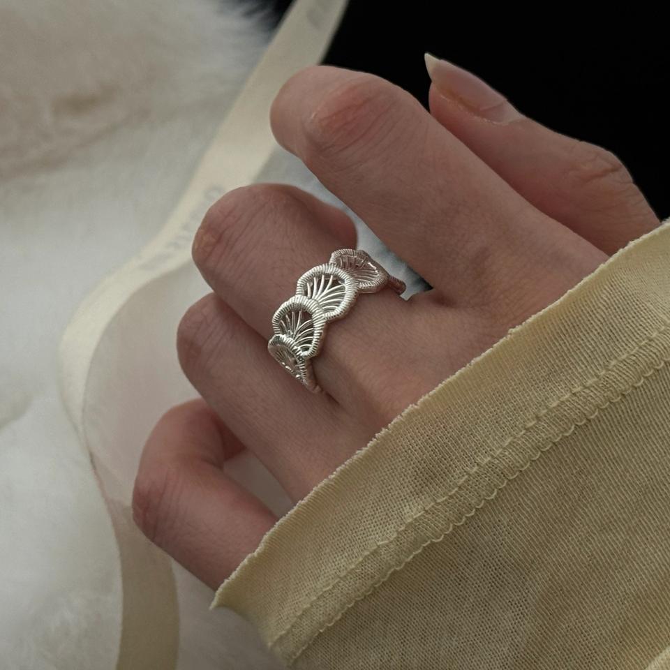 Bague florale en argent pur S925 avec motif de feuille de ventilateur de flocon de neige, douce et élégante avec un luxe médiéval et une sensation dorée