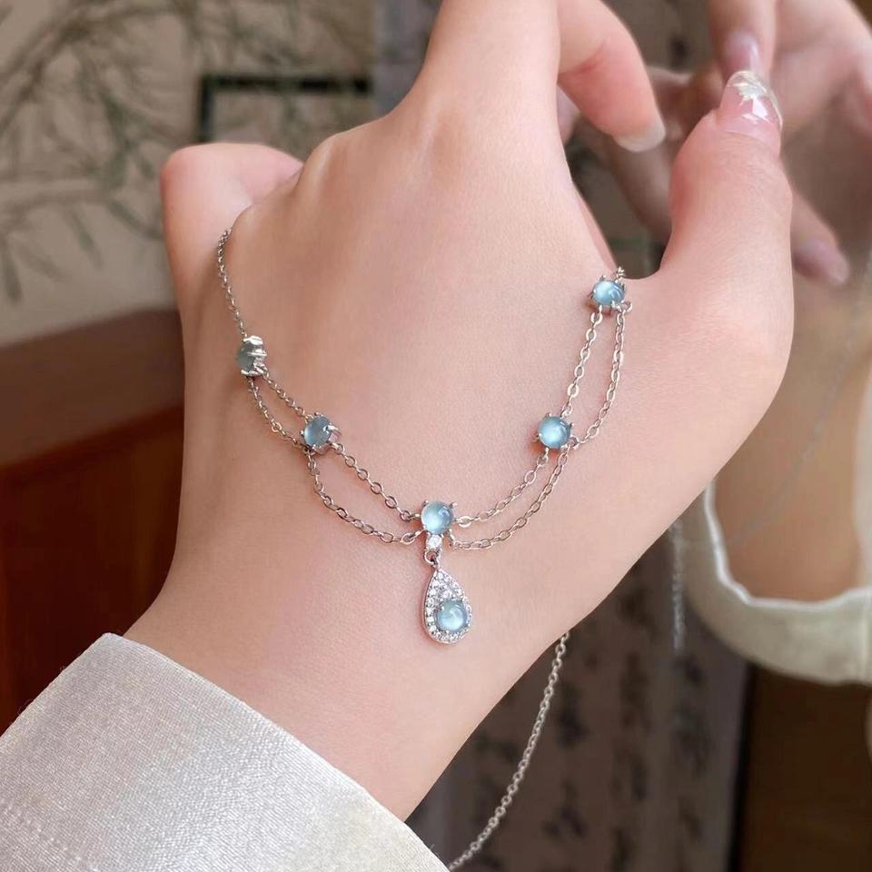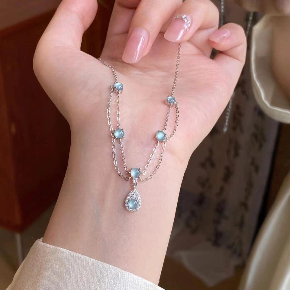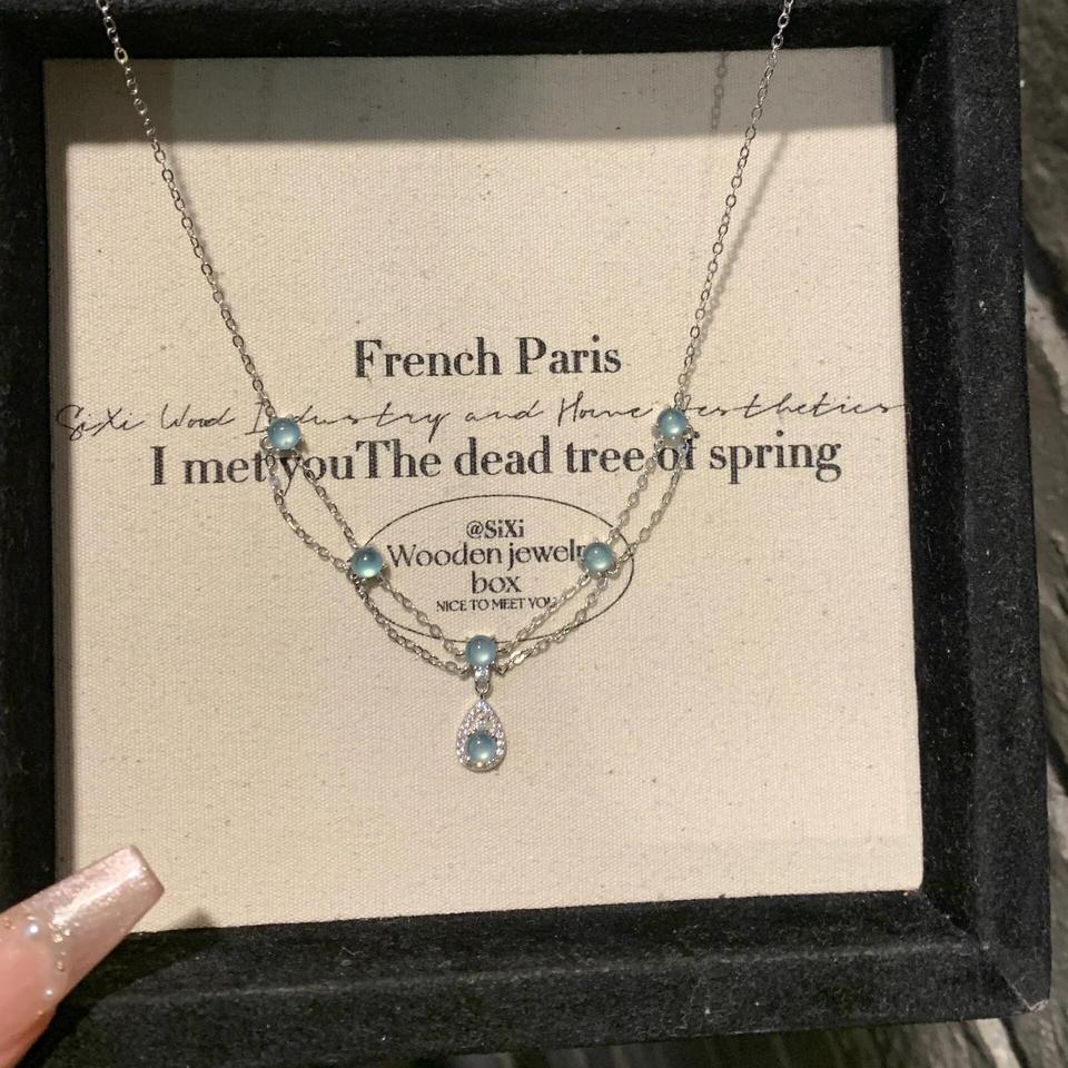 Collier Wenchi S925 en argent pur, luxueux et exquis, à double chaîne, avec pendentif goutte d'eau bleu glace et pompon, colliers de mode bleu marine
