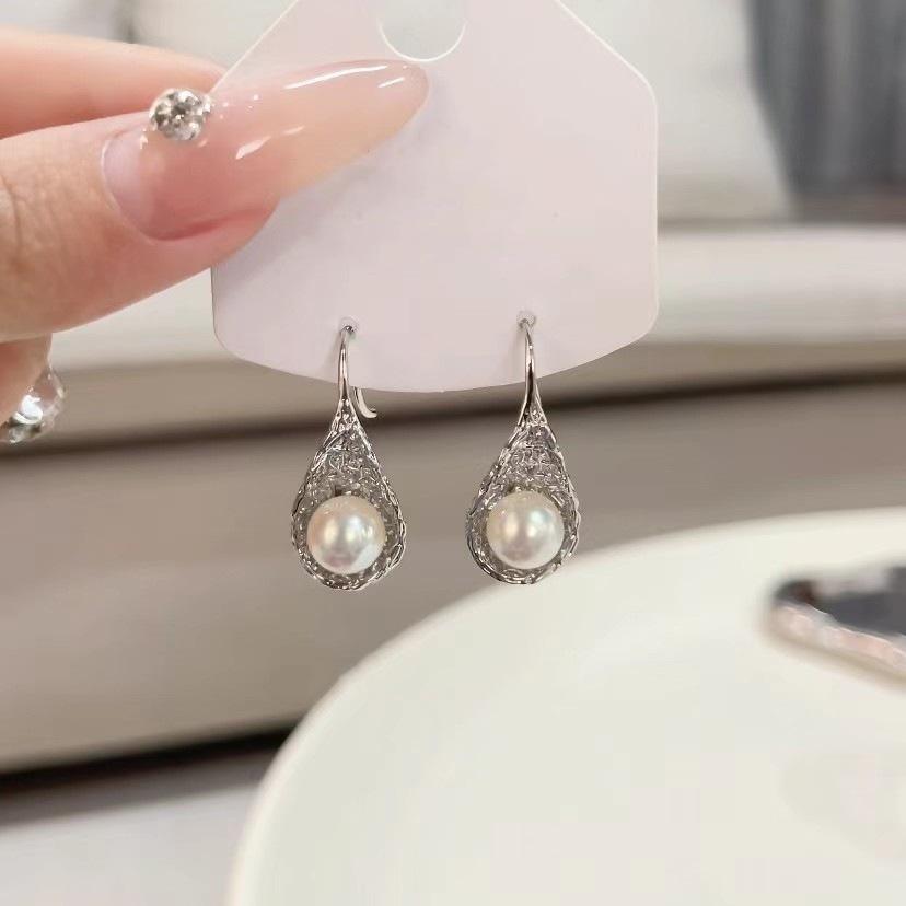 S925 Pure Silver Niche Bird's Nest Pearl Earrings Elegant Temperament Versatile Hollow Spoon High-End Water Droplet Shaped