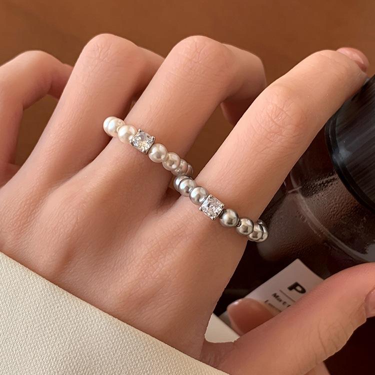 S925 Pure Silver Shijia Pearl Ring Elastic Thread Bead Small Cube Sugar Zircon Simple Daily Compact Ring Plain Fashionable