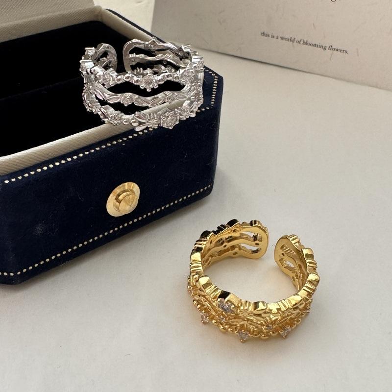 S925 Pure Silver Vintage Lace Ring with Niche Design 18K Plating Light Luxury French Carved Retro Zircon Inlay Open Mouth Ring